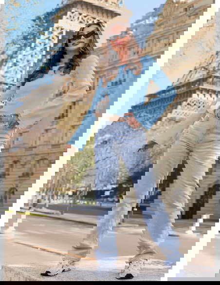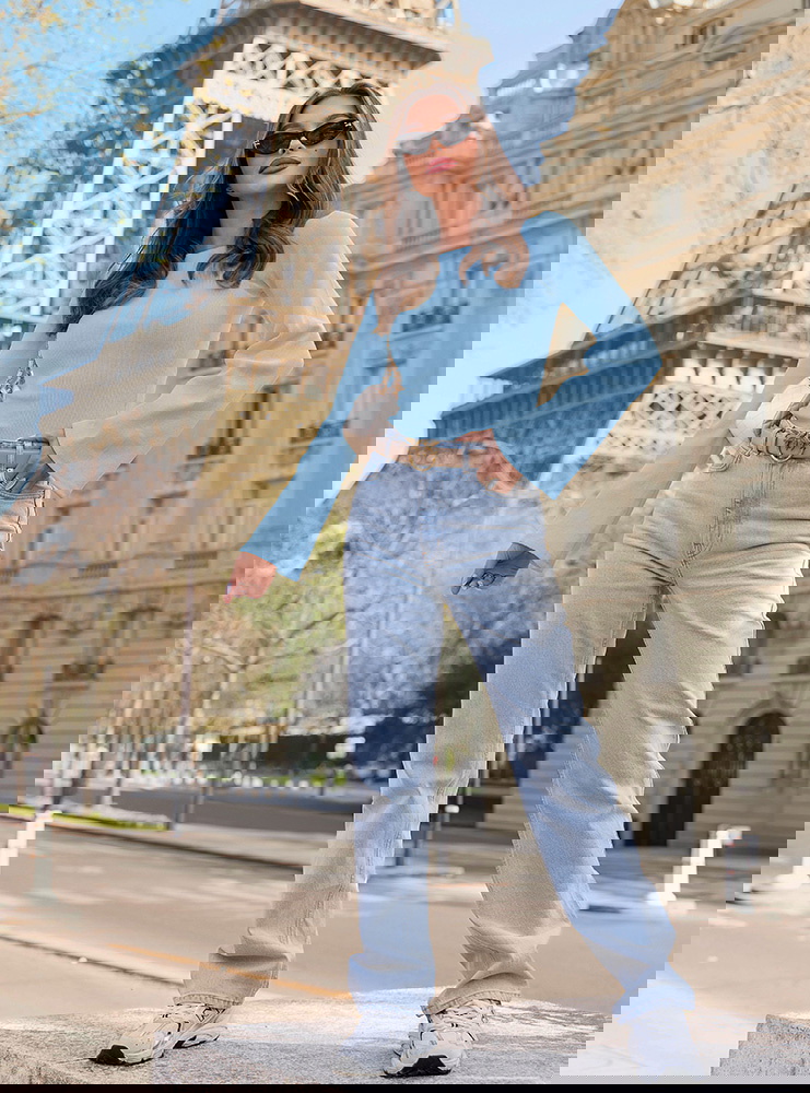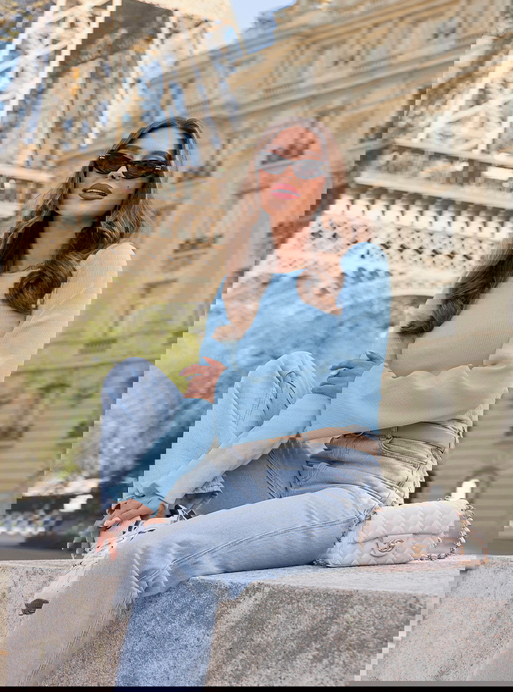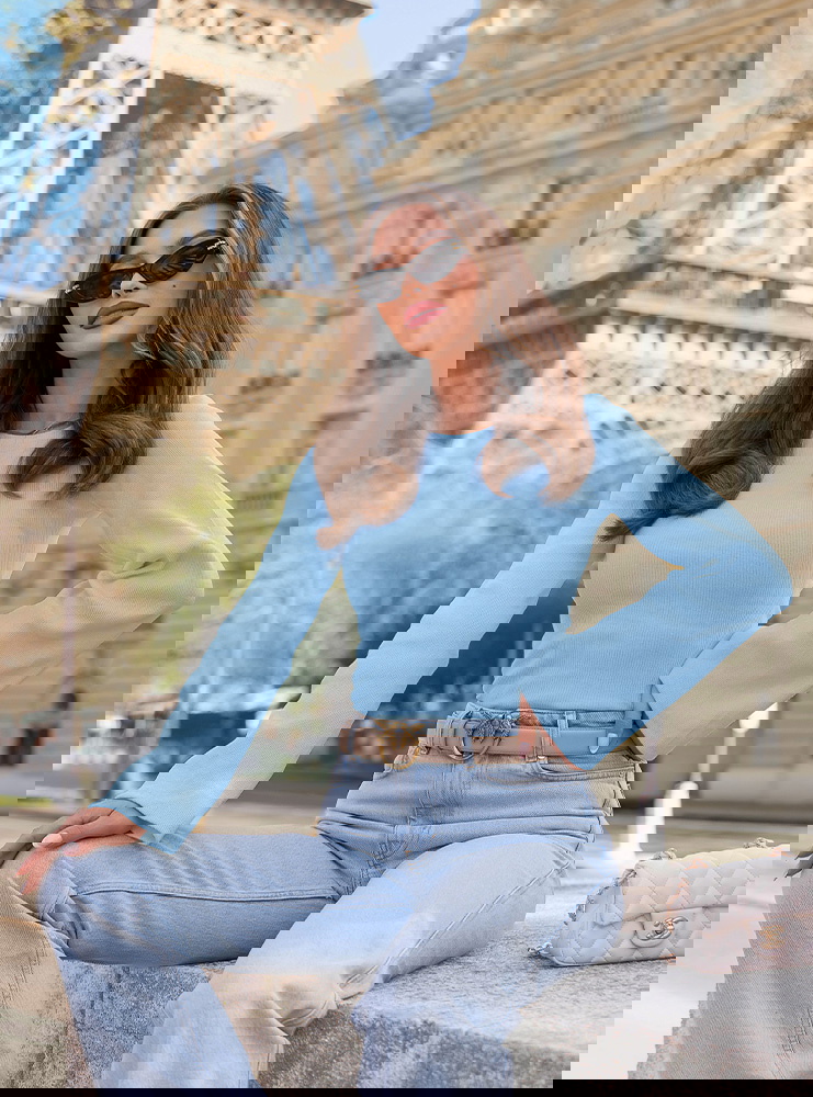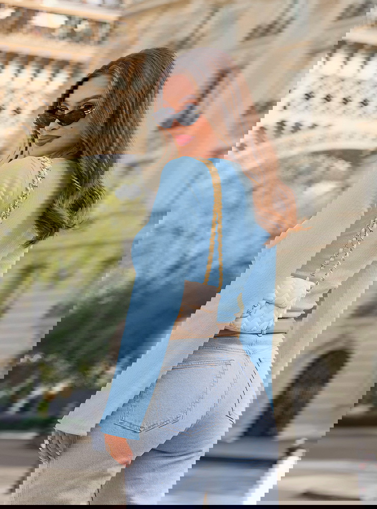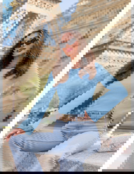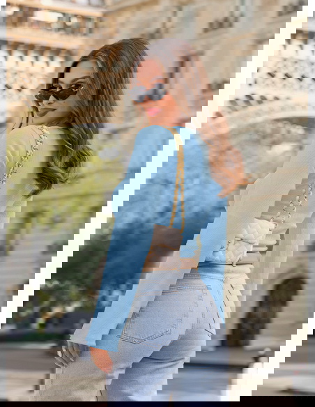 Błękitna prążkowana bluzka z rozszerzanym rękawem Chanelle to model, który wyróżnia się detalem, ale nadal pozostaje bardzo uniwersalny. Dopasowany krój podkreśla sylwetkę i ładnie układa się na ciele, a prążkowany materiał dodaje całości subtelnej struktury. Długie rękawy rozszerzają się ku dołowi, dzięki czemu przy każdym ruchu tworzą lekki, efektowny akcent. Błękitny kolor wygląda świeżo i delikatnie, świetnie rozjaśniając stylizację. Materiał jest przyjemny w noszeniu i dobrze dopasowuje się do figury. To bluzka, która łączy wygodę z wyrazistym wyglądem. W kolekcji Bonjour Paris pojawia się jako element, który nadaje stylizacjom lekkości i nowoczesnego wykończenia.