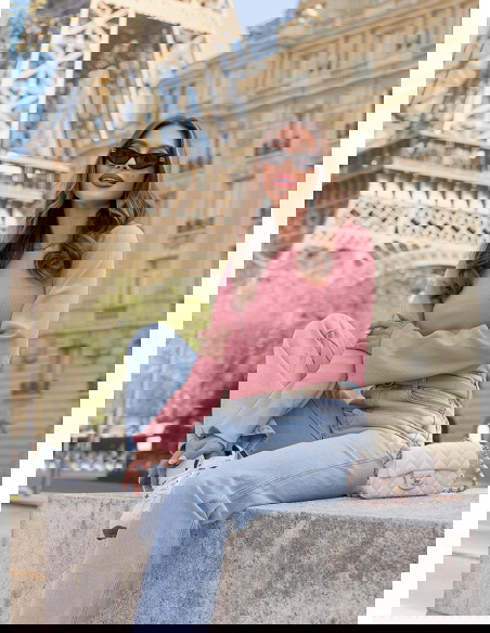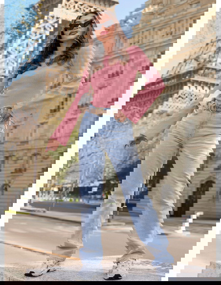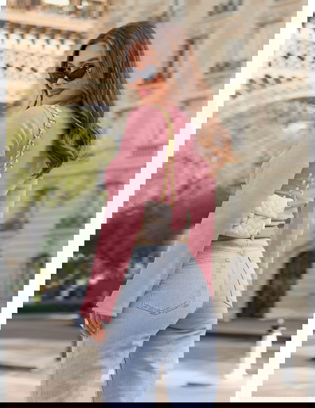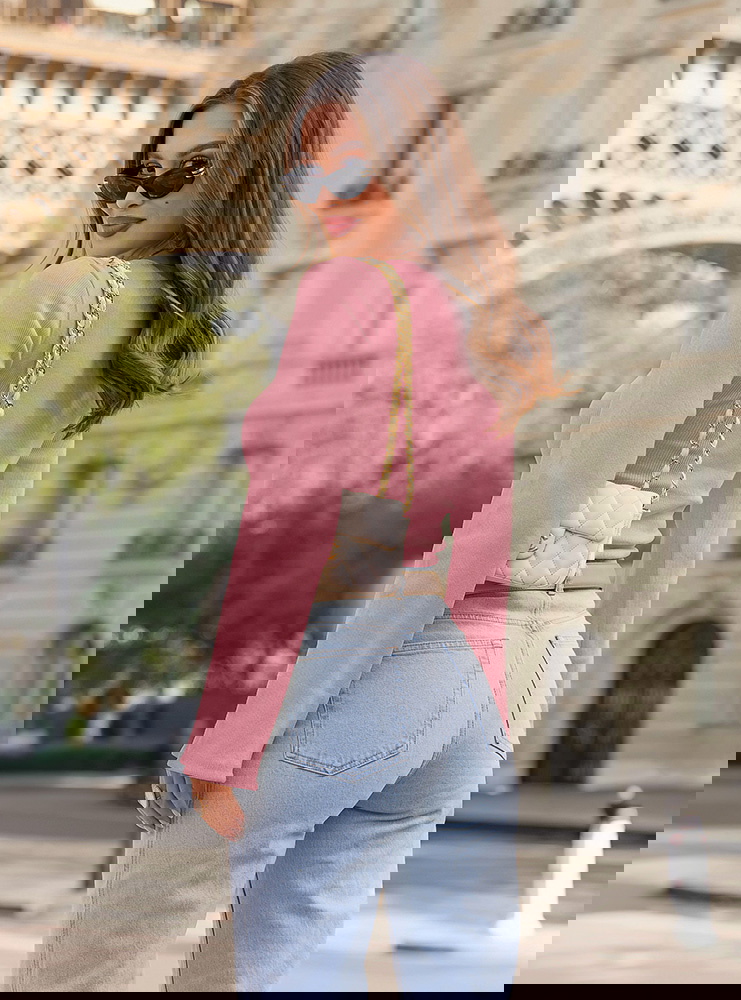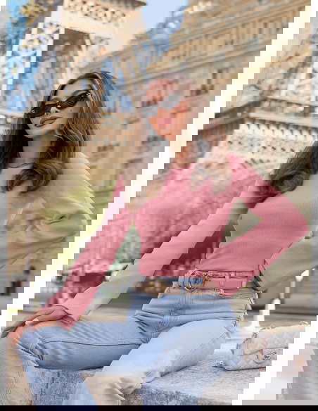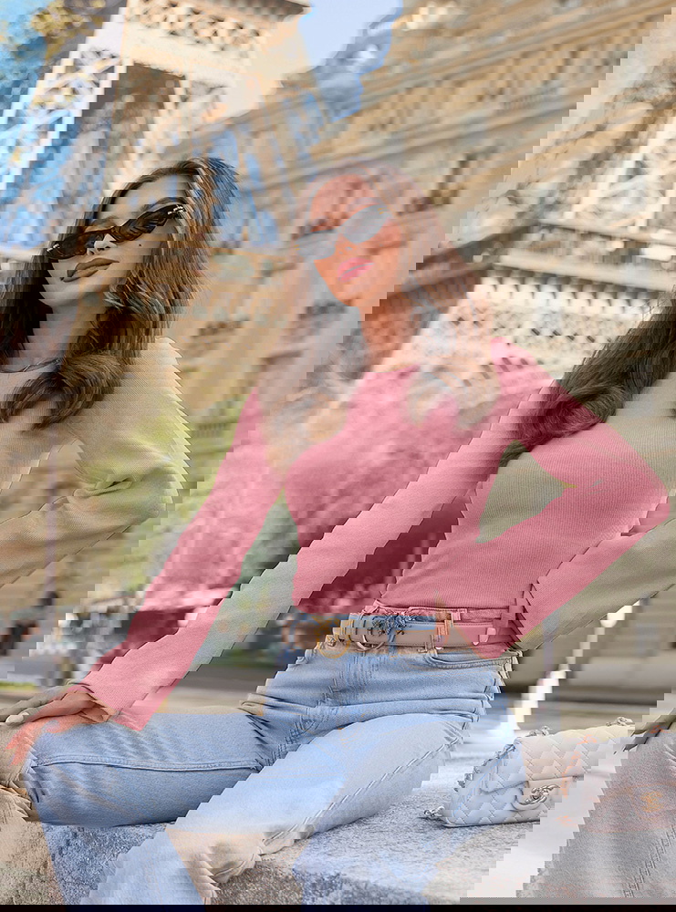 Prążkowana bluzka z rozszerzanym rękawem Chanelle – brudny róż to model, który od razu przyciąga uwagę kolorem i formą. Dopasowany krój podkreśla sylwetkę, a prążkowany materiał delikatnie ją modeluje i nadaje całości ciekawszego wykończenia. Długie rękawy rozszerzane ku dołowi dodają lekkości i sprawiają, że każdy ruch wygląda bardziej swobodnie. Odcień brudnego różu jest stonowany, ale nadal bardzo kobiecy, dzięki czemu łatwo wpasowuje się w różne stylizacje. Materiał jest przyjemny w dotyku i dobrze układa się na ciele. To bluzka, która łączy prostotę z wyraźnym detalem. W Bonjour Paris pojawia się jako element, który subtelnie podkręca codzienne stylizacje.