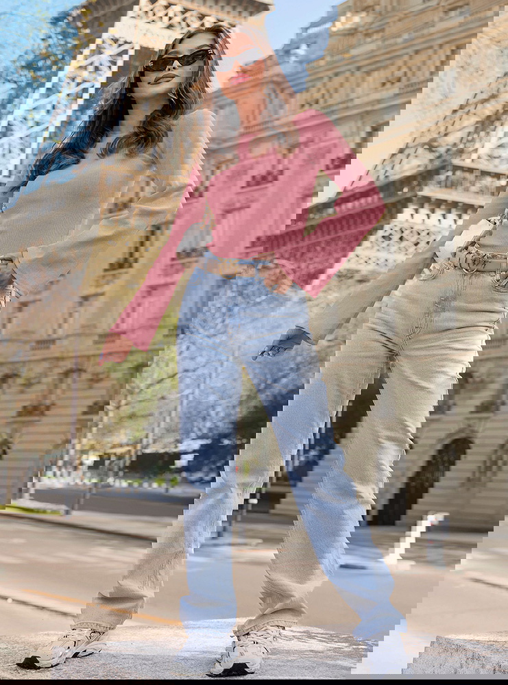Kolor, który przyciąga spojrzenia i rękawy, które robią cały klimat stylizacji.