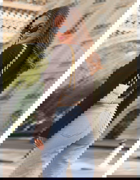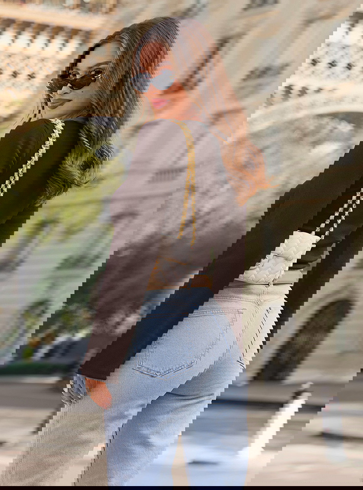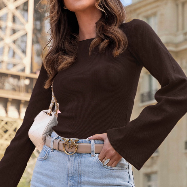 Czekoladowa prążkowana bluzka z rozszerzanym rękawem Chanelle