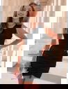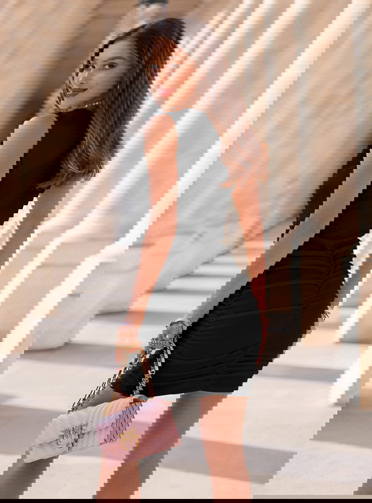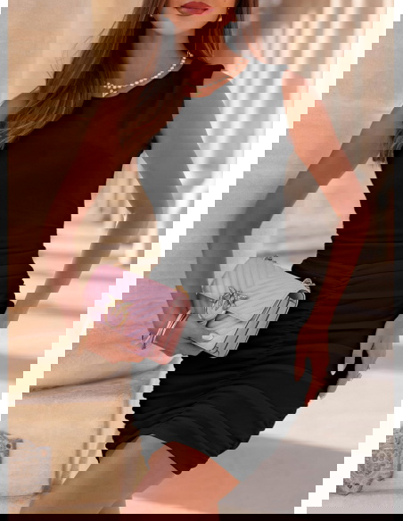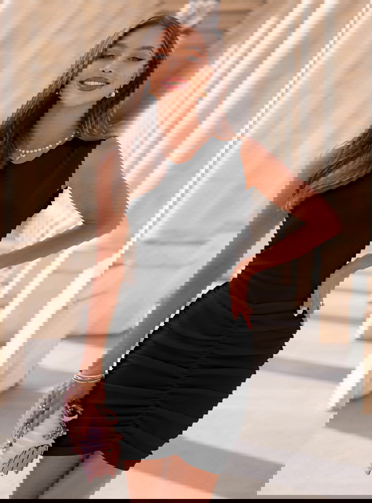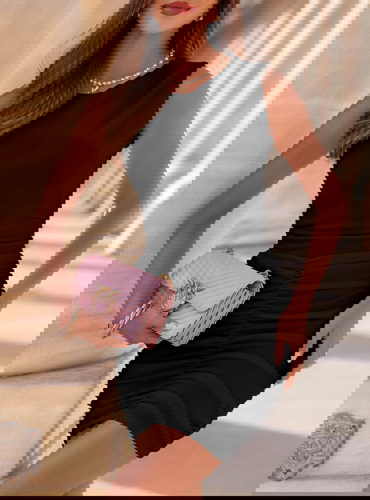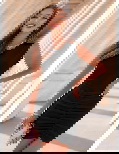 Czarna sukienka mini z marszczeniami Darena to model, który od razu robi efekt i podkreśla sylwetkę. Dopasowana góra ładnie układa się na ciele, a marszczony dół optycznie modeluje biodra i talię. Brak rękawów sprawia, że całość wygląda lekko i nowocześnie. Czerń dodaje elegancji i sprawia, że sukienka pasuje praktycznie na każdą okazję. Materiał dobrze dopasowuje się do ruchu i nie krępuje sylwetki. To propozycja, która łączy prostą formę z wyraźnym efektem. W kolekcji Bonjour Paris pojawia się jako mocniejszy, bardziej wieczorowy akcent.