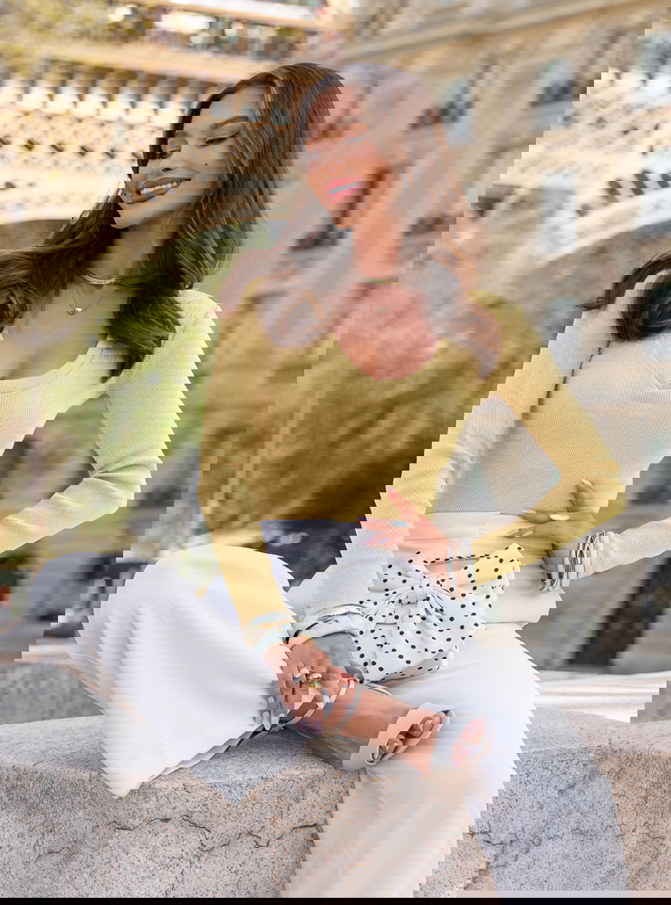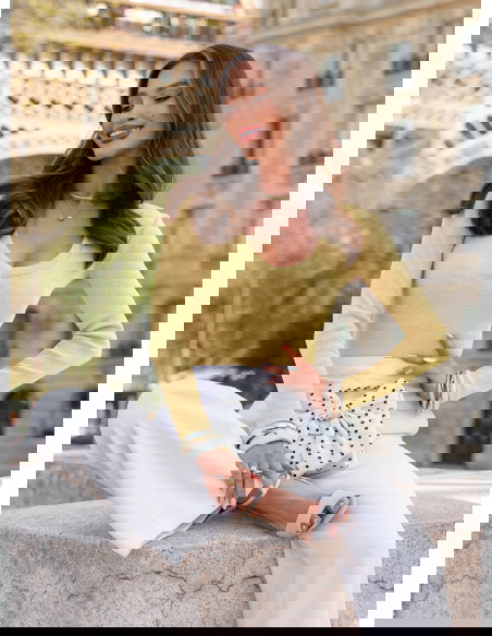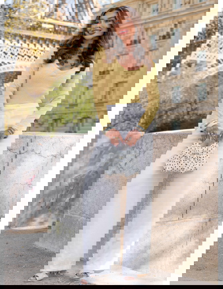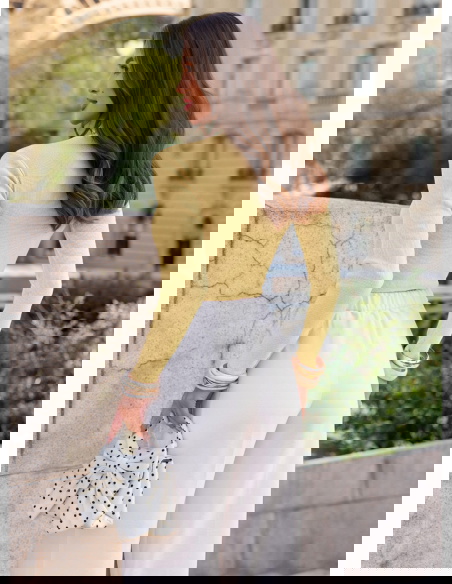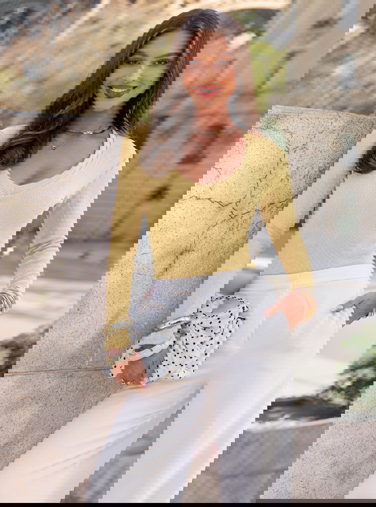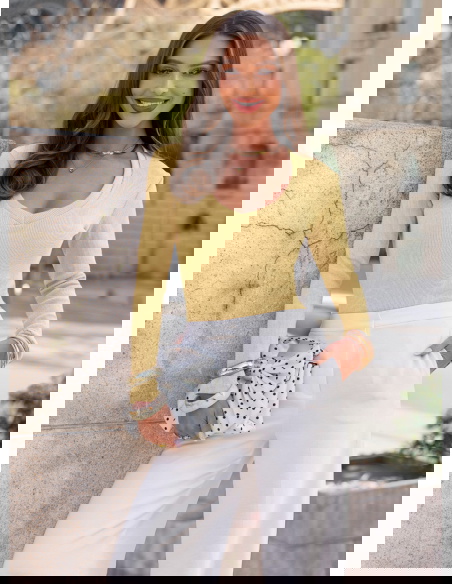 Prążkowana bluzka z dekoltem w serek Lovest - masełkowa przyciąga uwagę delikatnym, ciepłym kolorem, który od razu rozjaśnia całą stylizację. Dopasowany fason ładnie układa się na sylwetce, podkreślając talię i nadając proporcjom lekkości. Prążkowana faktura dodaje całości subtelnej struktury, dzięki czemu bluzka nie wygląda płasko. Dekolt w serek wysmukla górę sylwetki i sprawia, że całość prezentuje się bardzo kobieco. Długie rękawy sprawiają, że model jest uniwersalny i sprawdzi się w wielu sytuacjach. To propozycja, która łączy prostotę z wyraźnym efektem wizualnym. W kolekcji Bonjour Paris wprowadza świeżość i jasny akcent do bardziej stonowanych zestawów.
