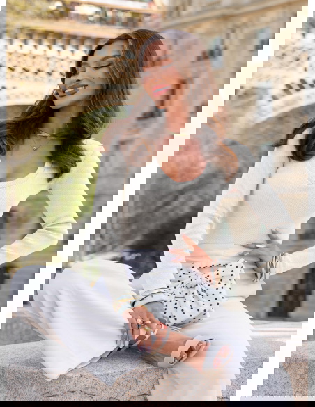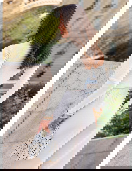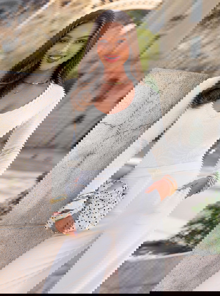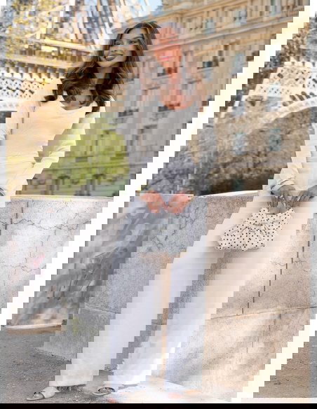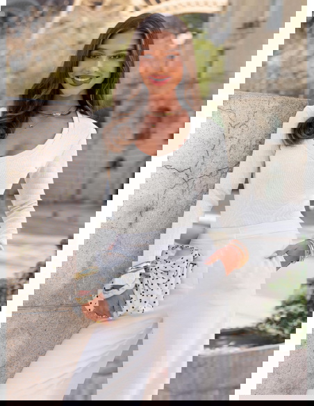 Prążkowana bluzka z dekoltem w serek Lovest - mleczna biel to lekka, świeża propozycja, która od razu rozjaśnia całą stylizację. Dopasowany fason podkreśla sylwetkę i ładnie układa się na ciele, a prążkowana struktura dodaje jej subtelnej głębi. Dekolt w serek delikatnie eksponuje górę sylwetki i optycznie ją wysmukla. Mleczna biel wygląda bardzo czysto i elegancko, ale nadal pozostaje miękka i kobieca w odbiorze. Długie rękawy sprawiają, że bluzka jest praktyczna i sprawdzi się w wielu sytuacjach. To model, który daje efekt zadbanego looku bez większego wysiłku. W kolekcji Bonjour Paris stanowi jasną bazę do bardziej dopracowanych zestawów.