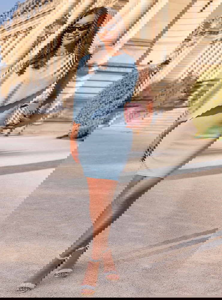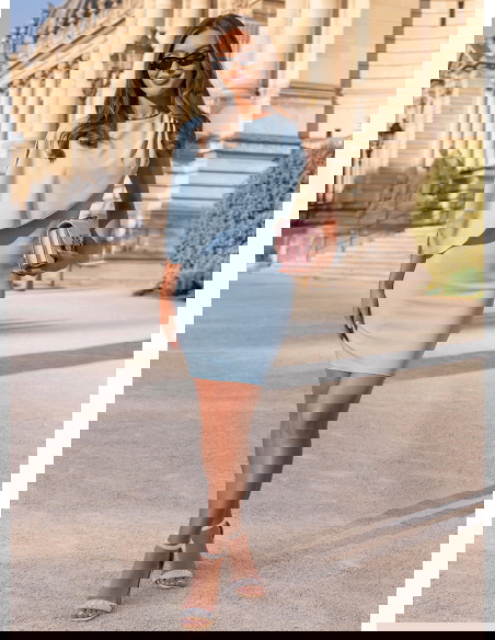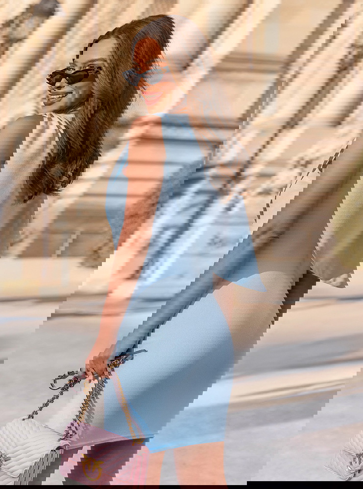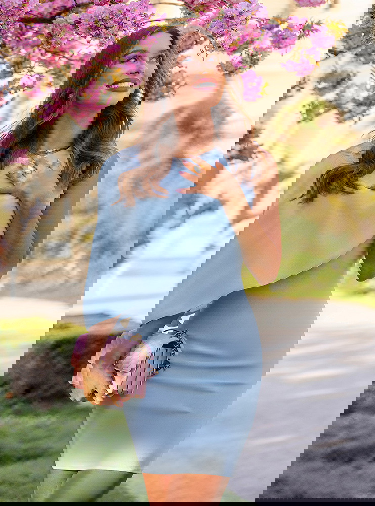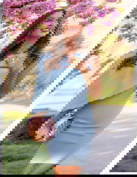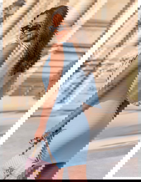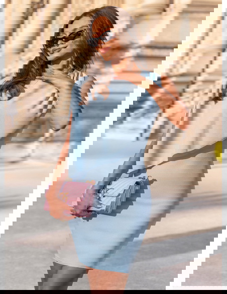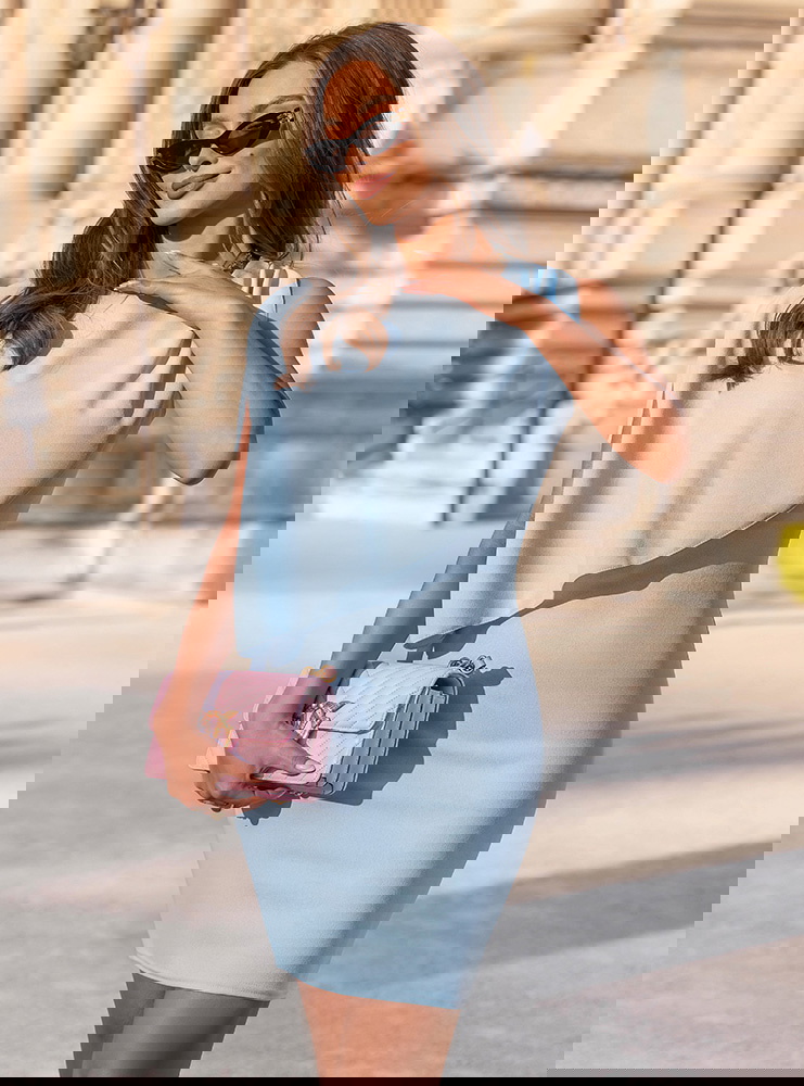 Błękitna asymetryczna dopasowana sukienka Celiane przyciąga uwagę nowoczesnym krojem i ciekawą formą góry. Dopasowany fason podkreśla sylwetkę, a marszczenia delikatnie modelują jej linię. Asymetryczny element materiału na górze tworzy efekt lekkiej narzutki, który dodaje całości ruchu i wyróżnia ten model na tle klasycznych sukienek. Błękitny kolor wprowadza świeżość i subtelność, dzięki czemu całość wygląda lekko i bardzo kobieco. Brak rękawów dodatkowo podkreśla linię ramion i sprawia, że sukienka świetnie sprawdzi się w cieplejsze dni. To model, który łączy prostotę z wyraźnym efektem wizualnym. W kolekcji Bonjour Paris pojawia się jako bardziej nowoczesna i stylowa propozycja.