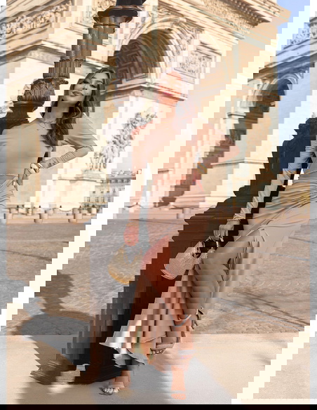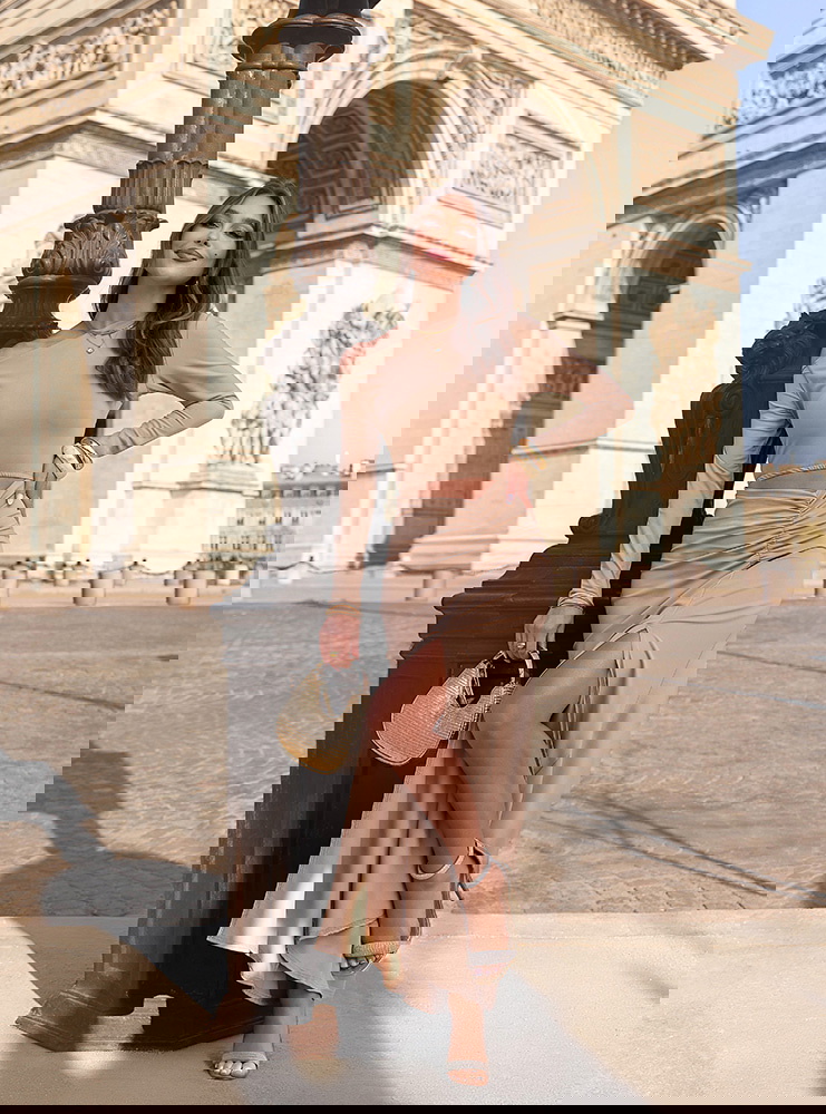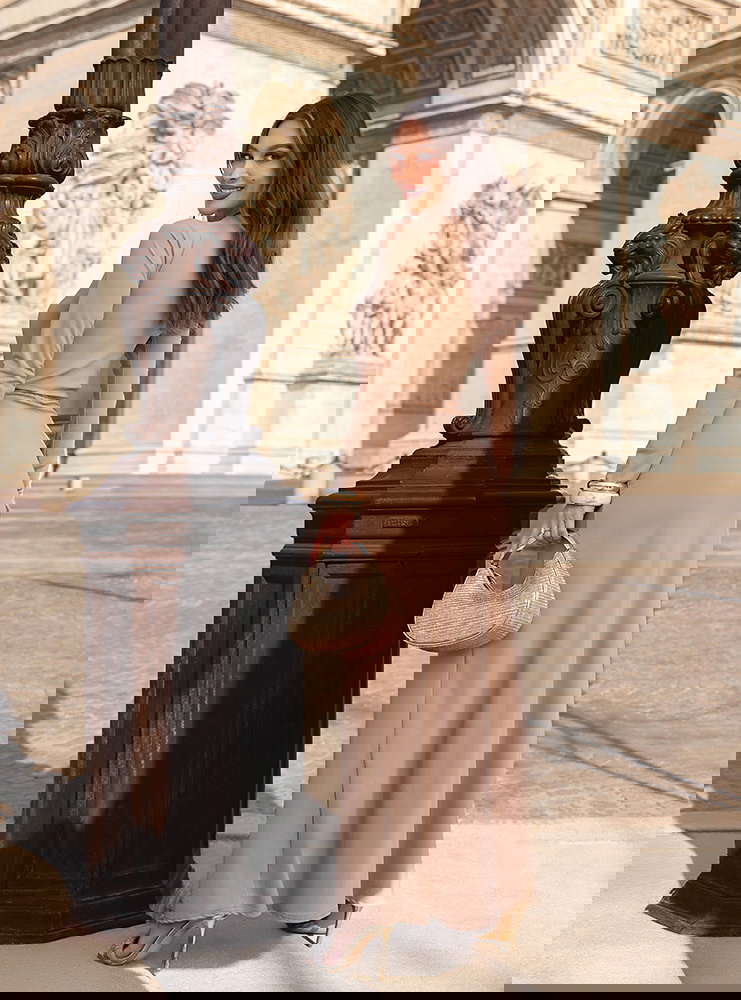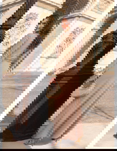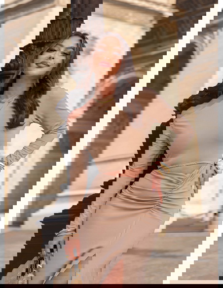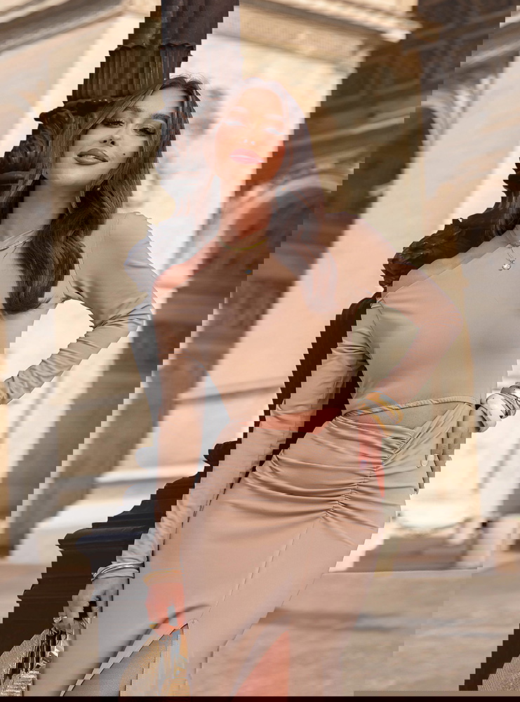 Beżowa sukienka z wycięciem na brzuchu Nanette