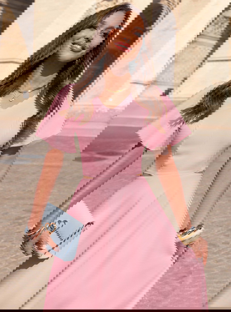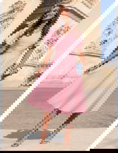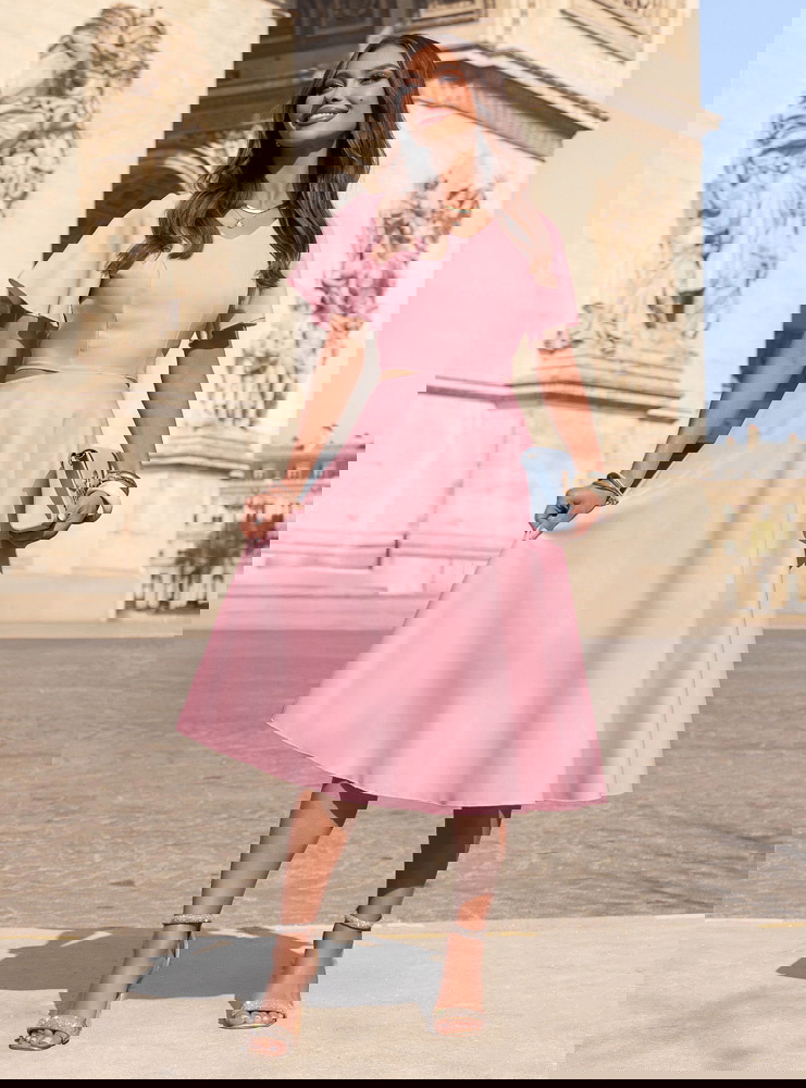 Pudrowa sukienka midi rozkloszowana...