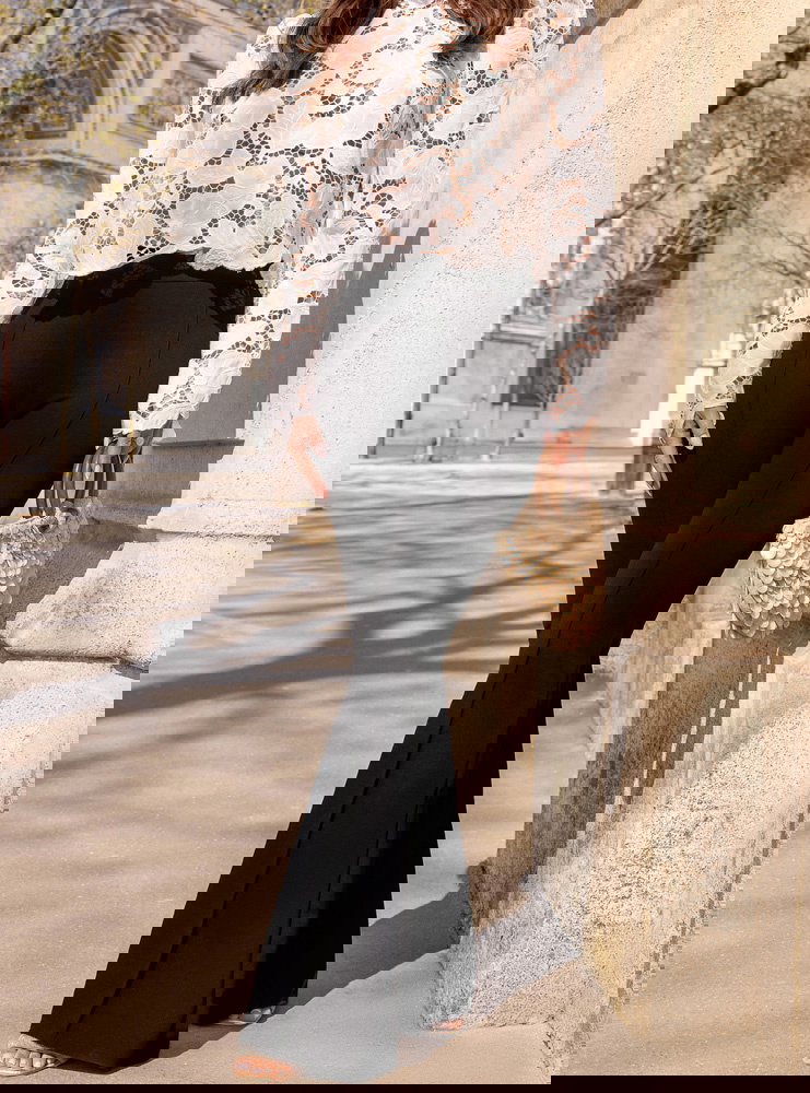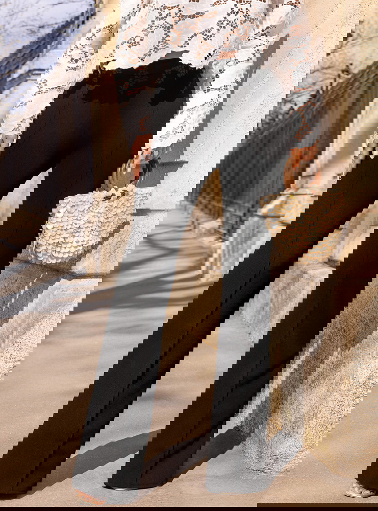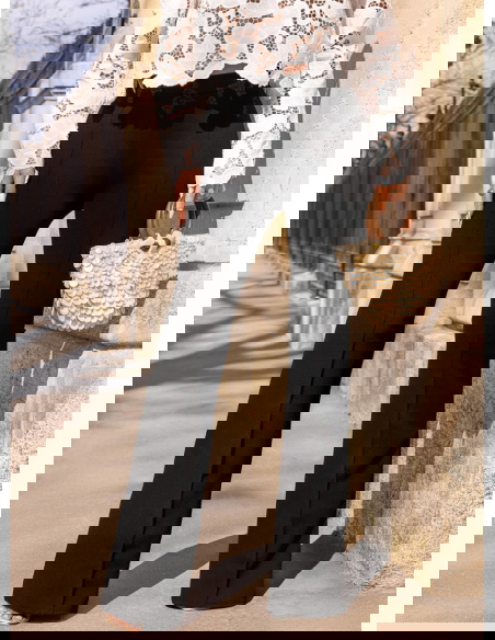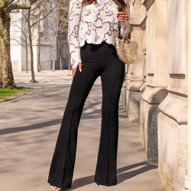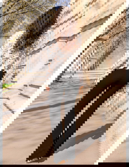 Szeroka nogawka i pionowe przeszycia sprawiają, że te spodnie pięknie wydłużają sylwetkę i wyglądają bardzo stylowo.