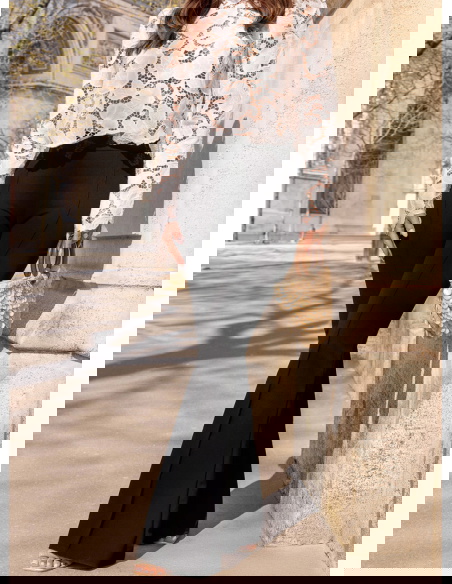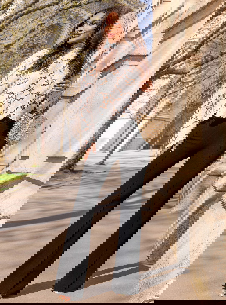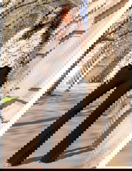 Czarne spodnie z szerokimi nogawkami Ileanna to model, który łączy wygodę z bardzo eleganckim efektem. Szerokie nogawki pięknie układają się w ruchu i nadają sylwetce lekkości. Wysoki stan podkreśla talię i optycznie wydłuża nogi. Pionowe przeszycia z przodu dodatkowo wysmuklają i porządkują całą formę. Materiał dobrze trzyma kształt, dzięki czemu spodnie prezentują się schludnie przez cały dzień. Czarny kolor sprawia, że są niezwykle uniwersalne i łatwe do stylizowania. To model, który pasuje zarówno do bardziej eleganckich, jak i codziennych zestawów.