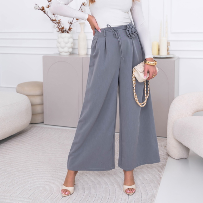 Szare szerokie spodnie z ozdobnym paskiem Cameal to model, który stawia na elegancję w lekkim, swobodnym wydaniu. Stonowany szary kolor sprawia, że całość wygląda bardzo stylowo i łatwo dopasowuje się do różnych elementów garderoby. Szerokie nogawki nadają sylwetce lekkości i tworzą płynny, ładnie układający się efekt w ruchu. Wysoki stan podkreśla talię i porządkuje proporcje. Ozdobny pasek z kwiatowym akcentem przyciąga uwagę i dodaje subtelnej kobiecości. Materiał układa się miękko i zapewnia wygodę przez cały dzień. To spodnie, które dobrze odnajdują się zarówno w codziennych, jak i bardziej eleganckich stylizacjach. Całość wygląda spokojnie, ale z charakterem.