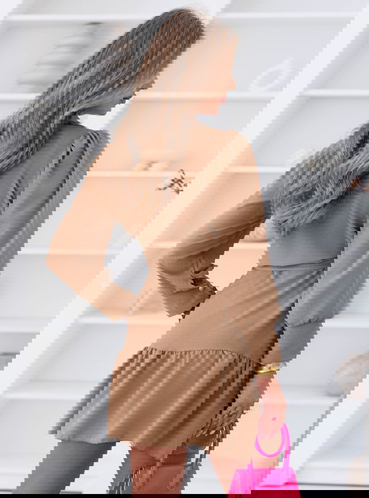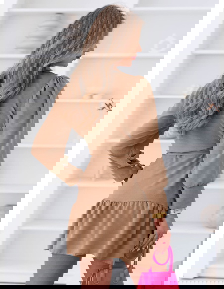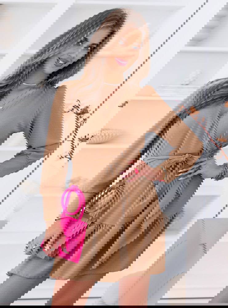Sukienka z przekładanym dekoltem Rajhimsa - mocha mousse to model, który łączy ciepły odcień z lekkim, kobiecym krojem. Kolor mocha mousse nadaje stylizacji miękkiego, eleganckiego charakteru i świetnie wpisuje się w spokojniejsze, dopracowane zestawy. Przekładany dekolt subtelnie podkreśla górną część sylwetki i ładnie się układa. Wiązanie w talii pozwala dopasować fason i zaznaczyć proporcje. Dół z falbaną dodaje lekkości i sprawia, że sukienka dobrze wygląda w ruchu. Długie rękawy równoważą całość i nadają jej bardziej eleganckiego wykończenia. Materiał miękko opada i zapewnia komfort noszenia. To model, który sprawdzi się zarówno na co dzień, jak i na bardziej dopracowane wyjścia.