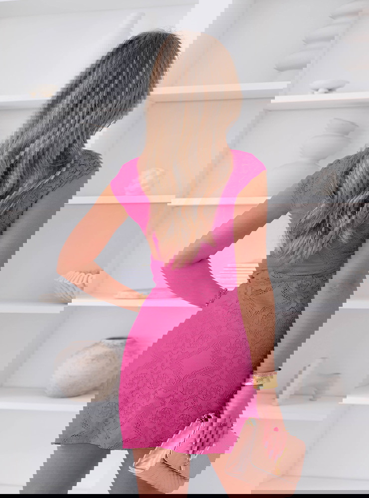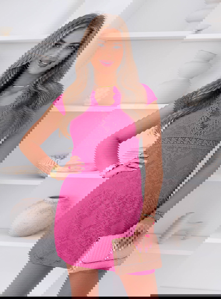 Koronkowa sukienka mini z ozdobnym dekoltem Ceamynnie - fuksja
