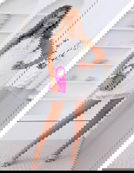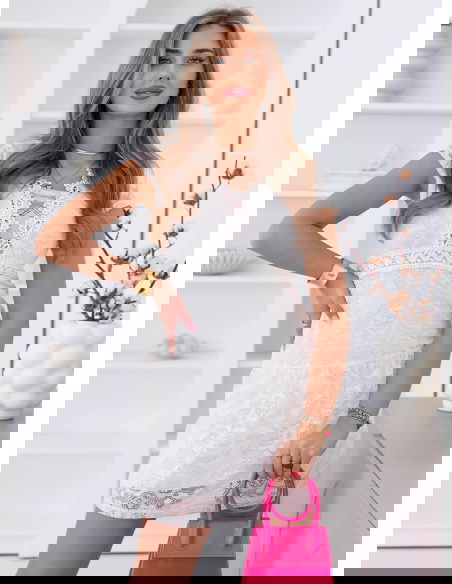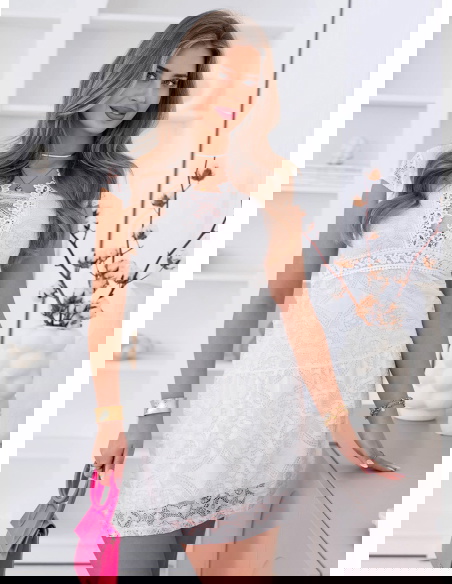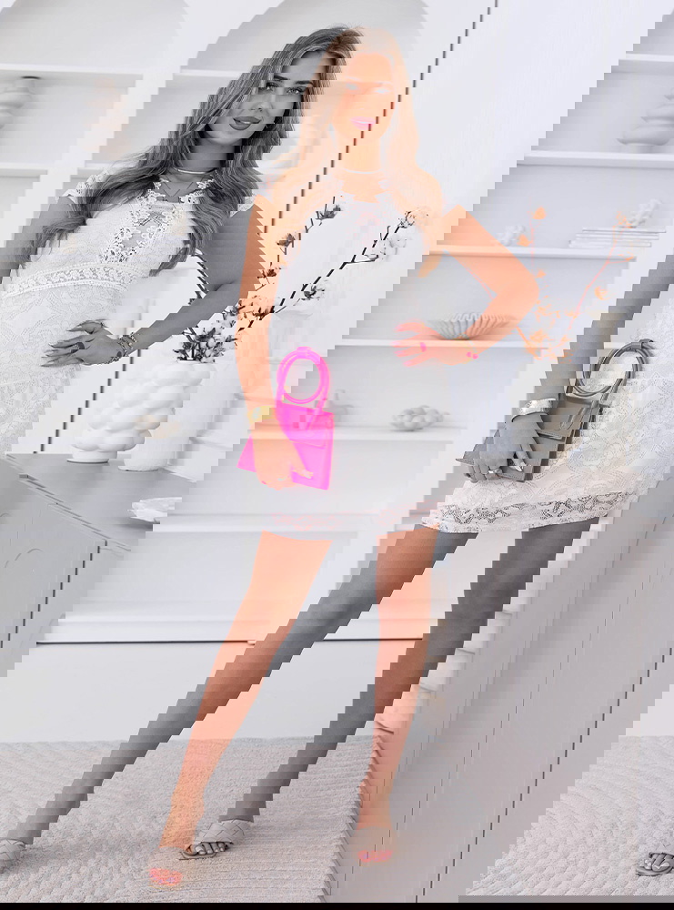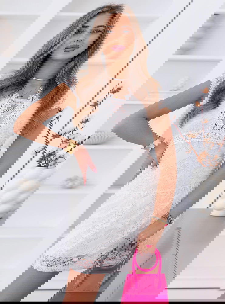 Biała koronkowa sukienka mini z ozdobnym dekoltem Ceamynnie