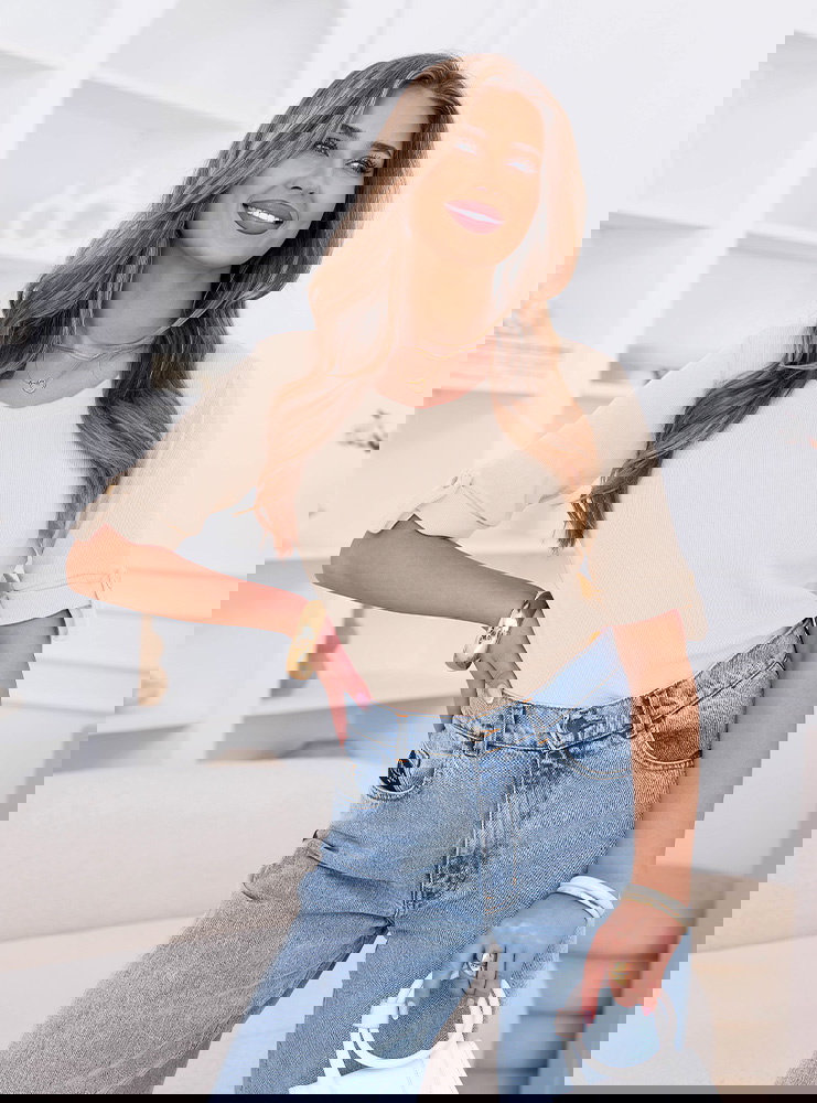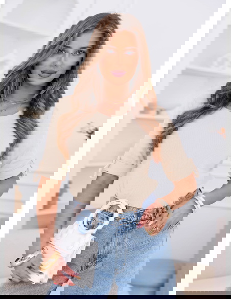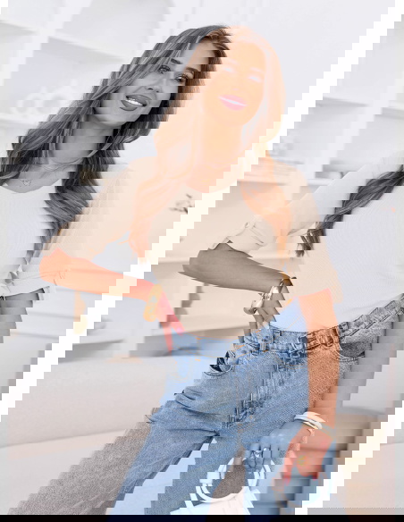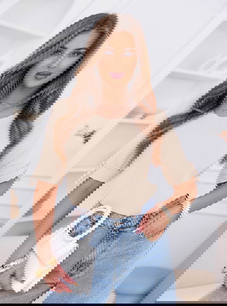 Beżowa prążkowana bluzka z krótkim rękawem Isadorinella