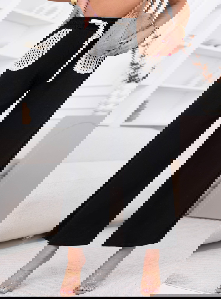 Czarne szerokie spodnie z kieszeniami Casadee to model, który łączy wygodny fason z ciekawym detalem. Czerń nadaje im uniwersalnego charakteru i sprawia, że łatwo dopasować je do różnych stylizacji. Szerokie nogawki dobrze układają się w ruchu i nadają sylwetce lekkości. W pasie znajduje się wiązanie, które pozwala lepiej dopasować spodnie i podkreślić talię. Ażurowe kieszenie z przodu przyciągają uwagę i dodają całości oryginalnego wykończenia. Materiał jest przyjemny w noszeniu i sprawdzi się na co dzień. To model, który łączy luz z dopracowanym wyglądem. Idealny wybór, jeśli chcesz czegoś wygodnego, ale z charakterem.