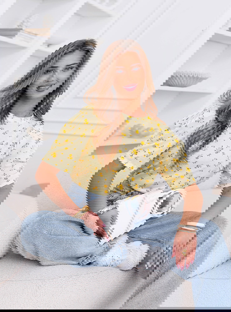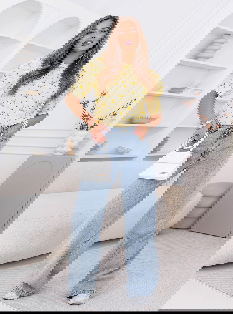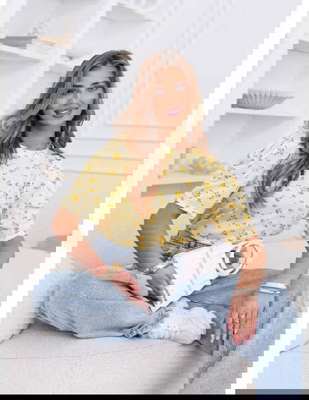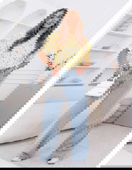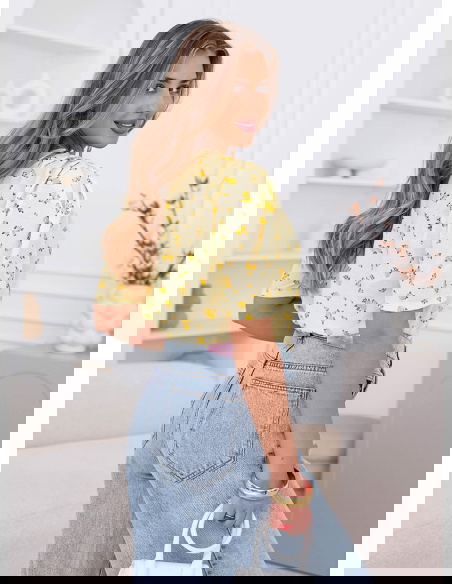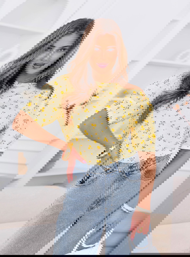 Żółta bluzka w kwiatowy wzór z bufiastymi rękawami Fioravireliana to model, który od razu dodaje stylizacji lekkości i świeżości. Żółty kolor w połączeniu z drobnym kwiatowym printem tworzy delikatny, wiosenny efekt. Bufiaste rękawy nadają całości subtelnej objętości i podkreślają kobiecy charakter fasonu. Bluzka ma swobodny krój, który dobrze układa się na sylwetce i zapewnia komfort noszenia. Materiał jest lekki i przyjemny, dzięki czemu sprawdzi się w cieplejsze dni. To model, który łatwo dopasować do codziennych stylizacji. Wzór przyciąga uwagę, ale nadal pozostaje spójny i lekki. Idealna propozycja, jeśli chcesz ożywić swój look.