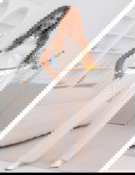 Jasnobeżowy komplet bluzka i szerokie spodnie z kieszeniami Amarila