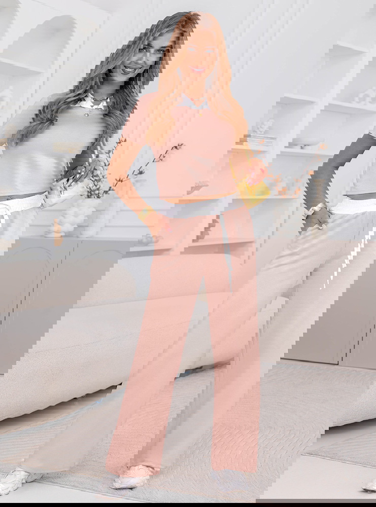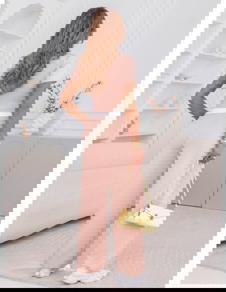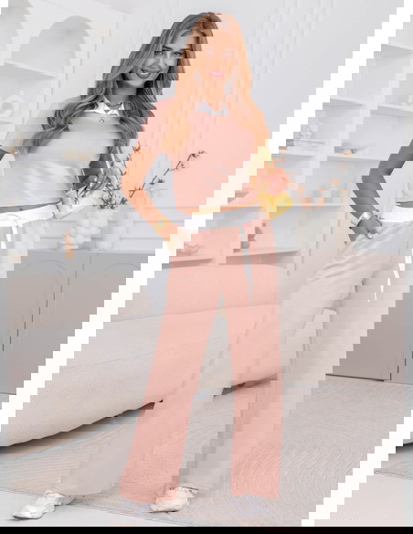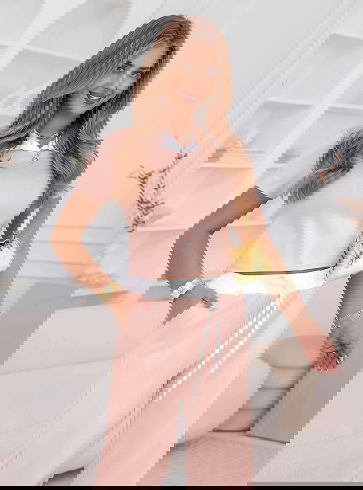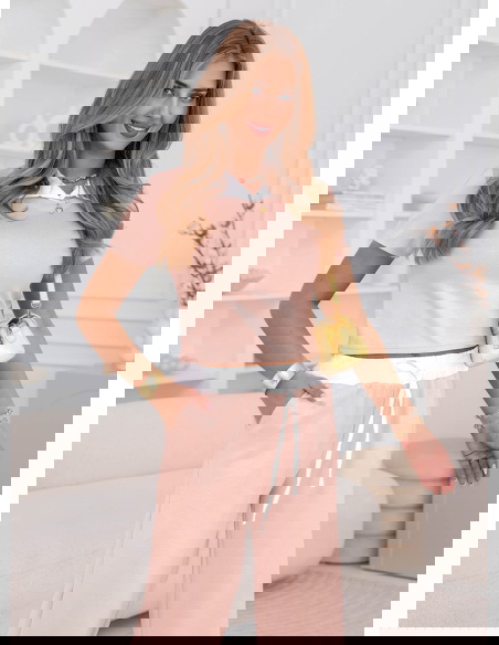 Pudrowy komplet bluzka i szerokie spodnie z kieszeniami Amarila to delikatna i kobieca propozycja, która świetnie sprawdza się na co dzień. Pudrowy kolor nadaje całości lekkości i sprawia, że stylizacja wygląda świeżo i subtelnie. Krótka bluzka z kołnierzykiem wyróżnia się na tle klasycznych modeli i dodaje całości uroku. Szerokie spodnie układają się miękko i zapewniają wygodę przez cały dzień. Elastyczny pas z wiązaniem pozwala łatwo dopasować komplet do sylwetki i podkreślić talię. Kieszenie zwiększają funkcjonalność i sprawiają, że zestaw jest jeszcze bardziej praktyczny. Całość tworzy spójny, lekki look idealny na cieplejsze dni. To komplet, który wygląda dobrze bez zbędnego wysiłku.