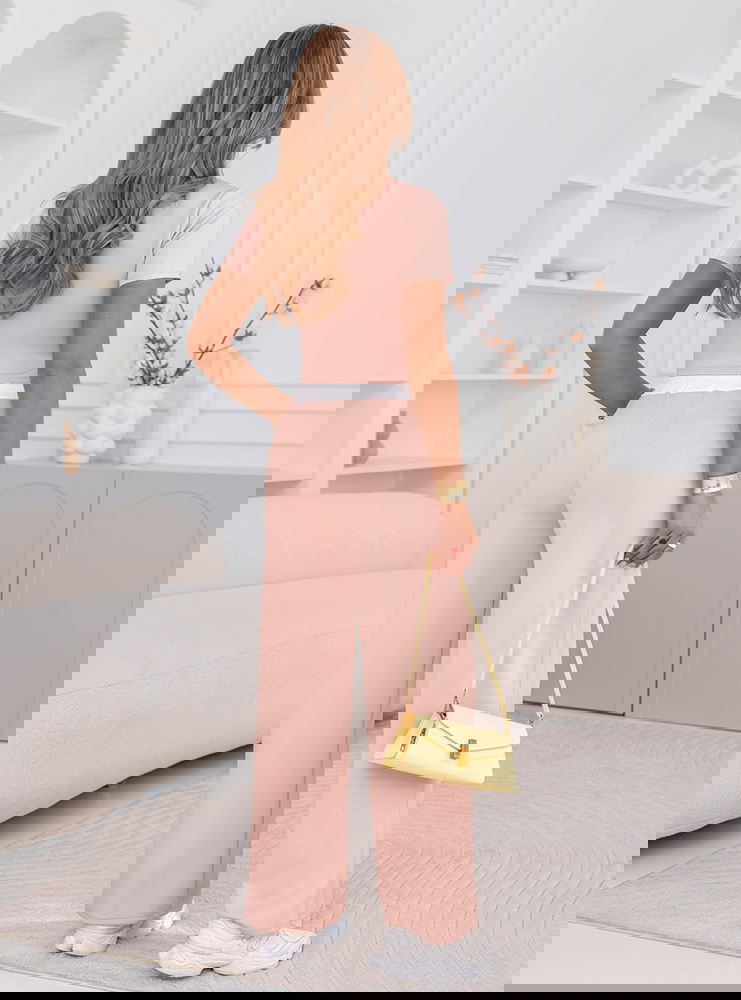 Pudrowy komplet bluzka i szerokie spodnie z kieszeniami Amarila