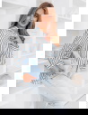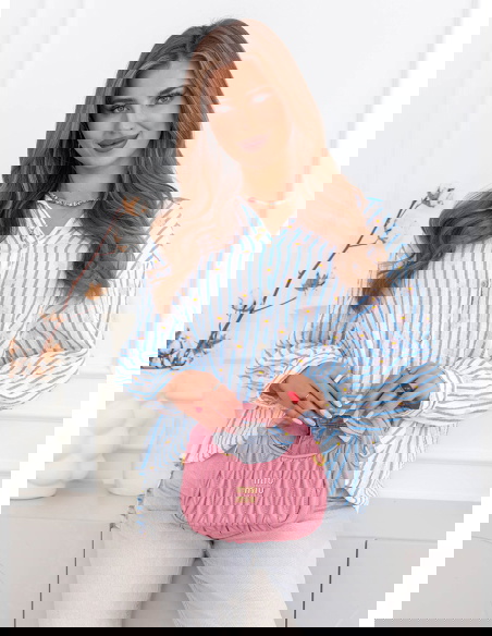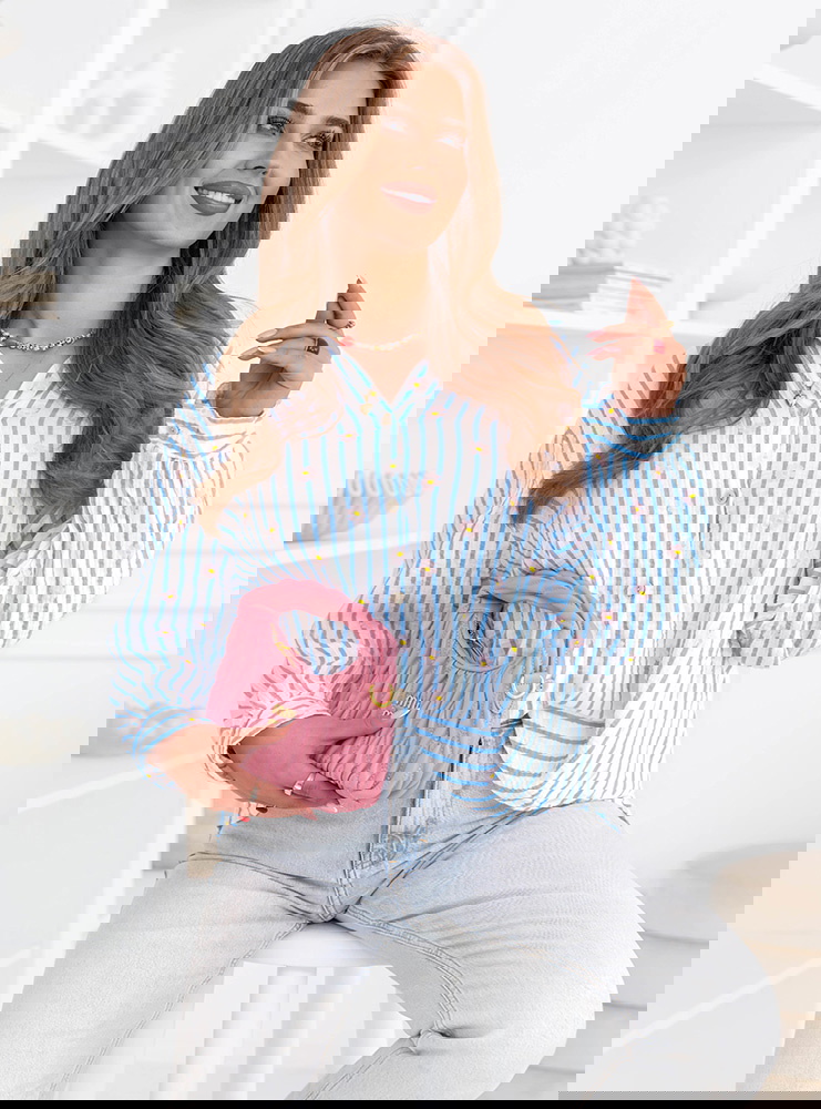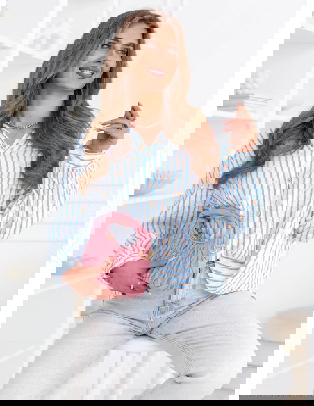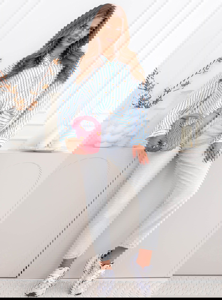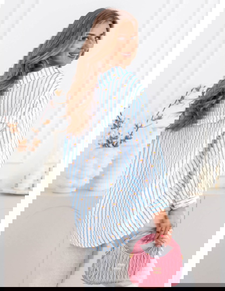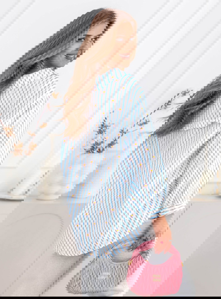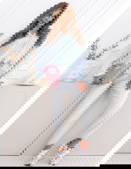 Muślinowa koszula w paski Emberlly – wzór 2 to idealna opcja, jeśli szukasz czegoś lekkiego, świeżego i niewymuszonego. Delikatny, przyjemny w noszeniu materiał sprawia, że świetnie sprawdza się na co dzień, szczególnie w cieplejsze dni. Niebieskie paski w połączeniu z subtelnym kwiatowym motywem nadają jej wyjątkowego, letniego charakteru. Luźniejszy krój daje pełną swobodę i sprawia, że koszula dobrze układa się na sylwetce. Zapięcie na guziki pozwala stylizować ją na różne sposoby – możesz nosić ją klasycznie lub bardziej na luzie. Dłuższy rękaw dodaje jej lekko eleganckiego akcentu, ale całość nadal pozostaje bardzo casualowa. To model, który łatwo dopasujesz do wielu rzeczy z garderoby. Sprawdzi się zarówno na szybkie wyjście, jak i spokojny dzień.