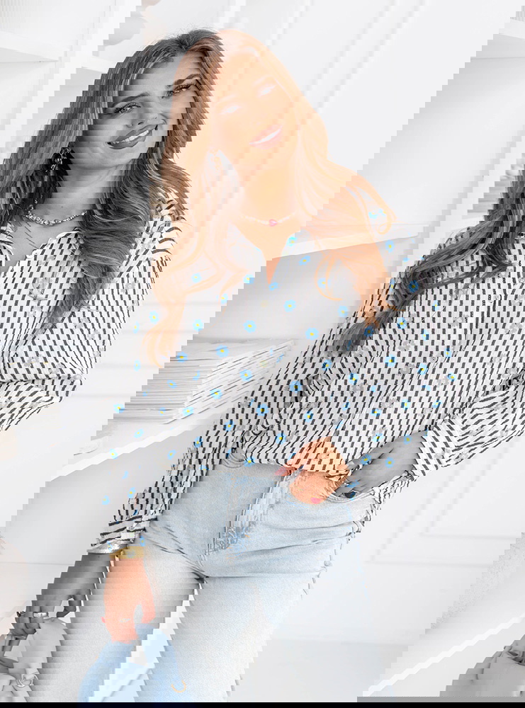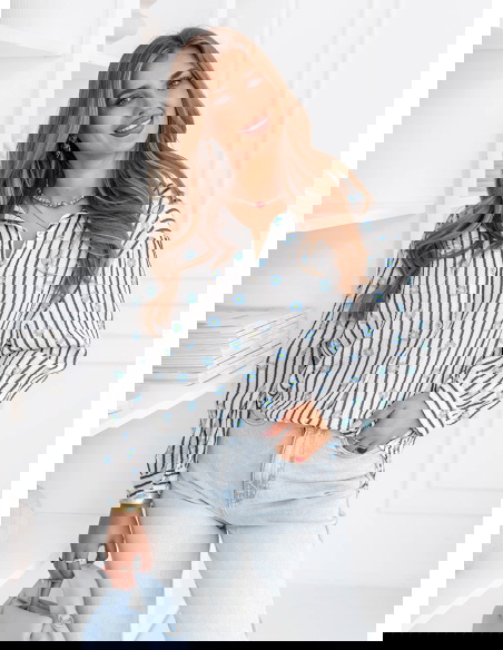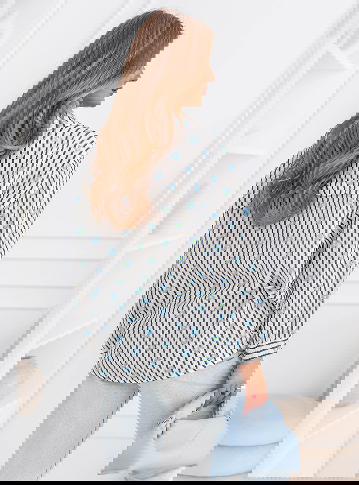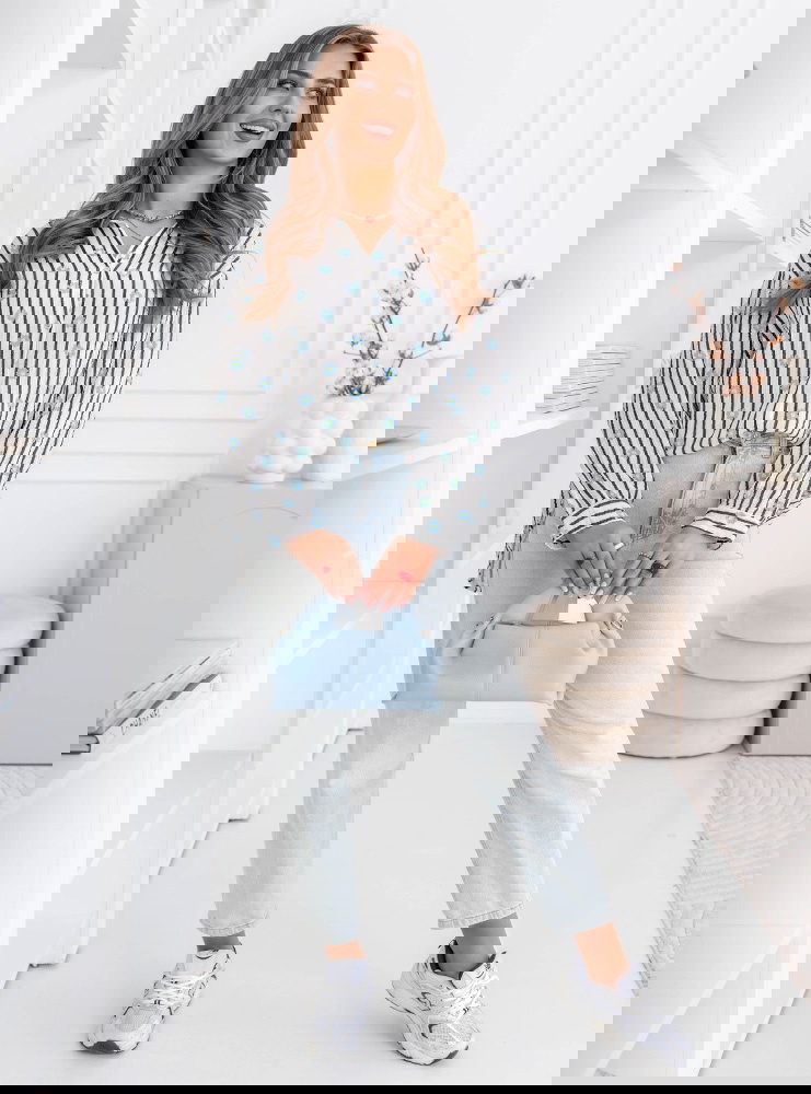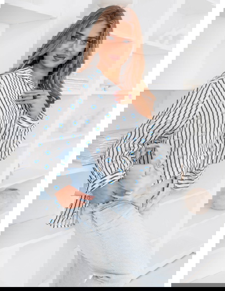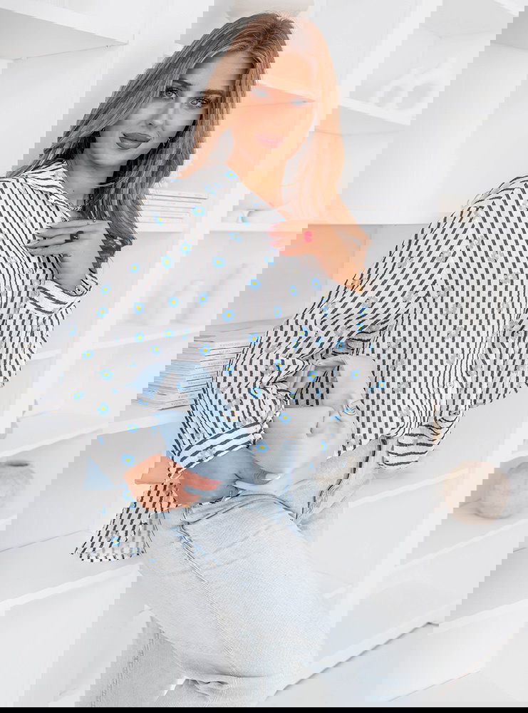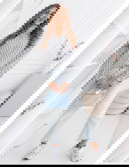 Muślinowa koszula w paski Emberlly – wzór 3 to lekka, codzienna baza, która od razu robi efekt bez większego wysiłku. Delikatny materiał sprawia, że jest przyjemna w noszeniu i dobrze sprawdza się w cieplejsze dni. Paski w połączeniu z drobnym kwiatowym wzorem nadają jej charakteru i sprawiają, że wygląda ciekawiej niż klasyczna koszula. Luźniejszy fason daje swobodę i naturalnie układa się na sylwetce. Zapięcie na guziki pozwala nosić ją na różne sposoby, zależnie od stylizacji. Dłuższy rękaw dodaje jej uniwersalności, dzięki czemu sprawdzi się nie tylko latem. To model, który łatwo dopasujesz do codziennych zestawów. Idealna, jeśli lubisz wygodę, ale nie chcesz rezygnować z fajnego efektu.