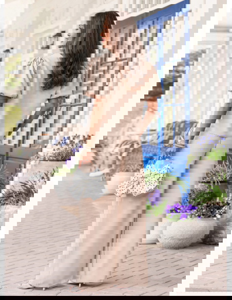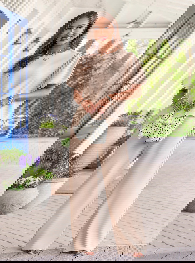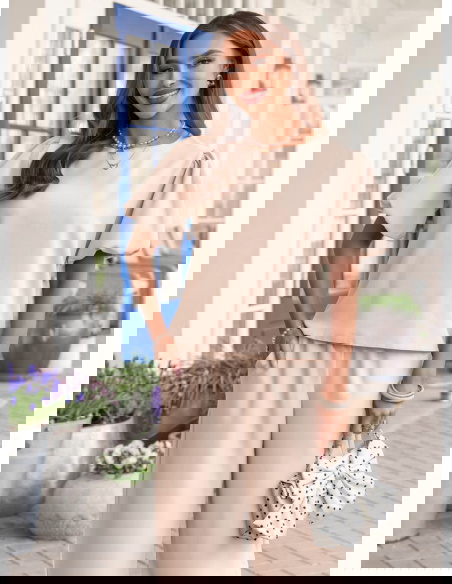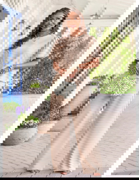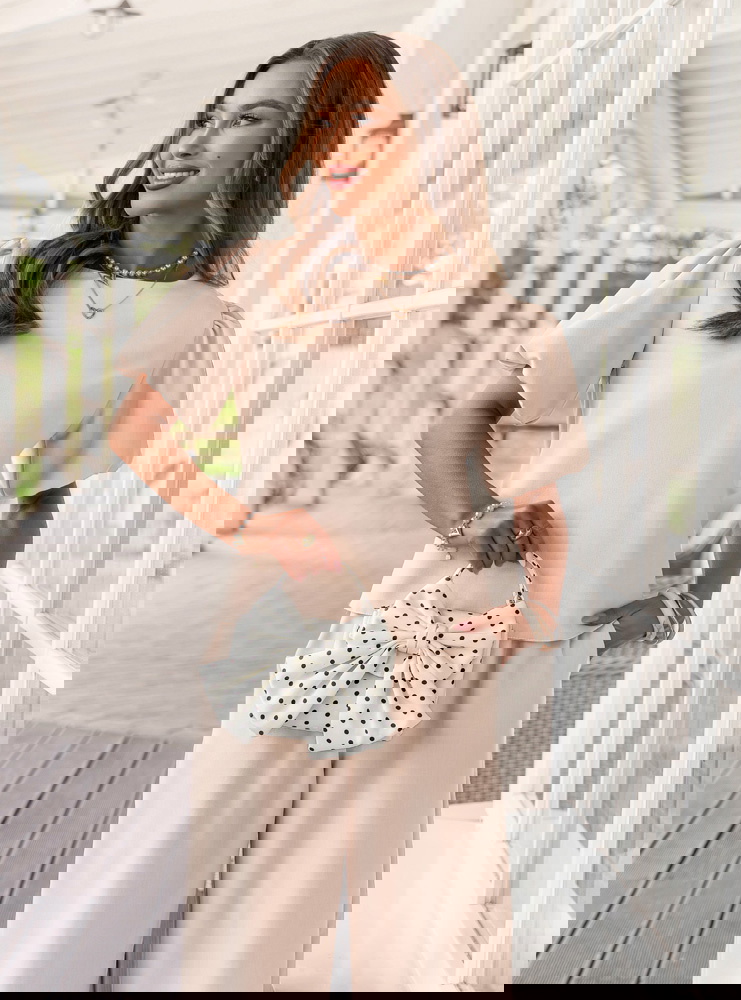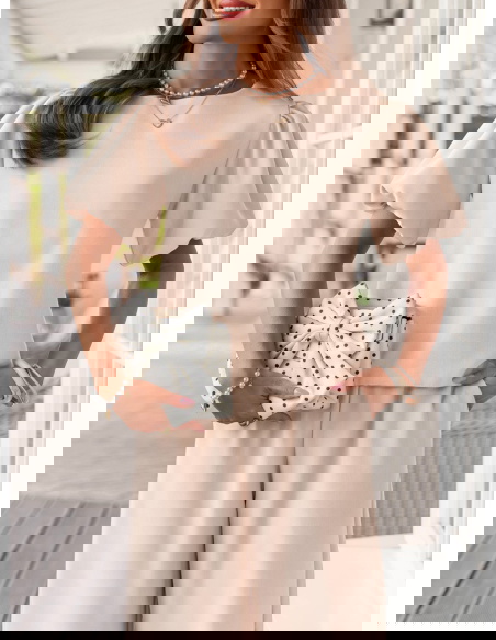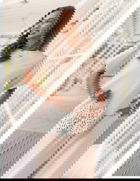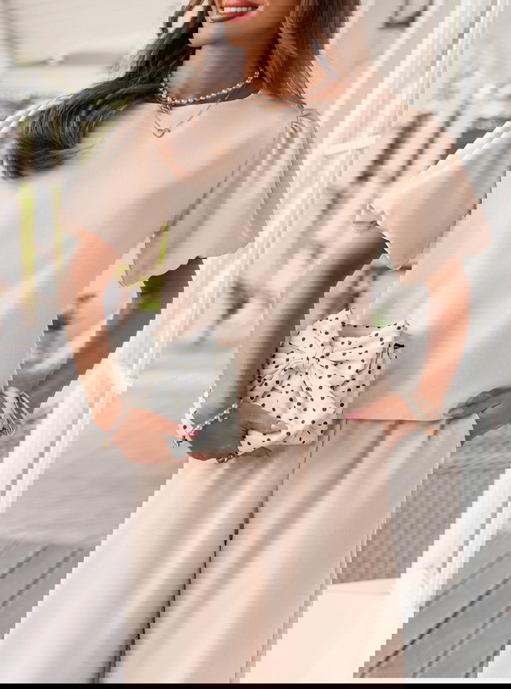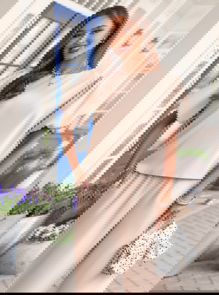 Jasnobeżowy komplet bluzka z bufiastymi rękawami i spodnie Darilynn to propozycja, która łączy delikatność z wyraźniejszym akcentem w kroju. Bluzka z bufiastymi rękawami przyciąga uwagę i dodaje sylwetce lekkości oraz objętości w górnej części. Prosty dół równoważy całość, dzięki czemu komplet wygląda spójnie i dobrze wyważony. Spodnie mają swobodniejszy fason i miękko układają się na sylwetce, dając komfort i naturalny efekt. Wysoki stan podkreśla talię i poprawia proporcje. Jasnobeżowy kolor wprowadza świeżość i sprawia, że stylizacja wygląda lekko i elegancko. Ten model świetnie wpisuje się w estetykę Bonjour Paris – subtelną, kobiecą i dopracowaną w detalach.