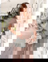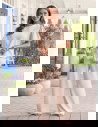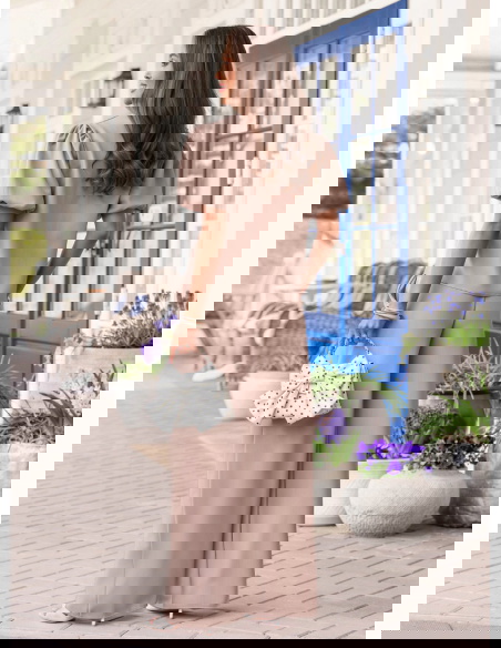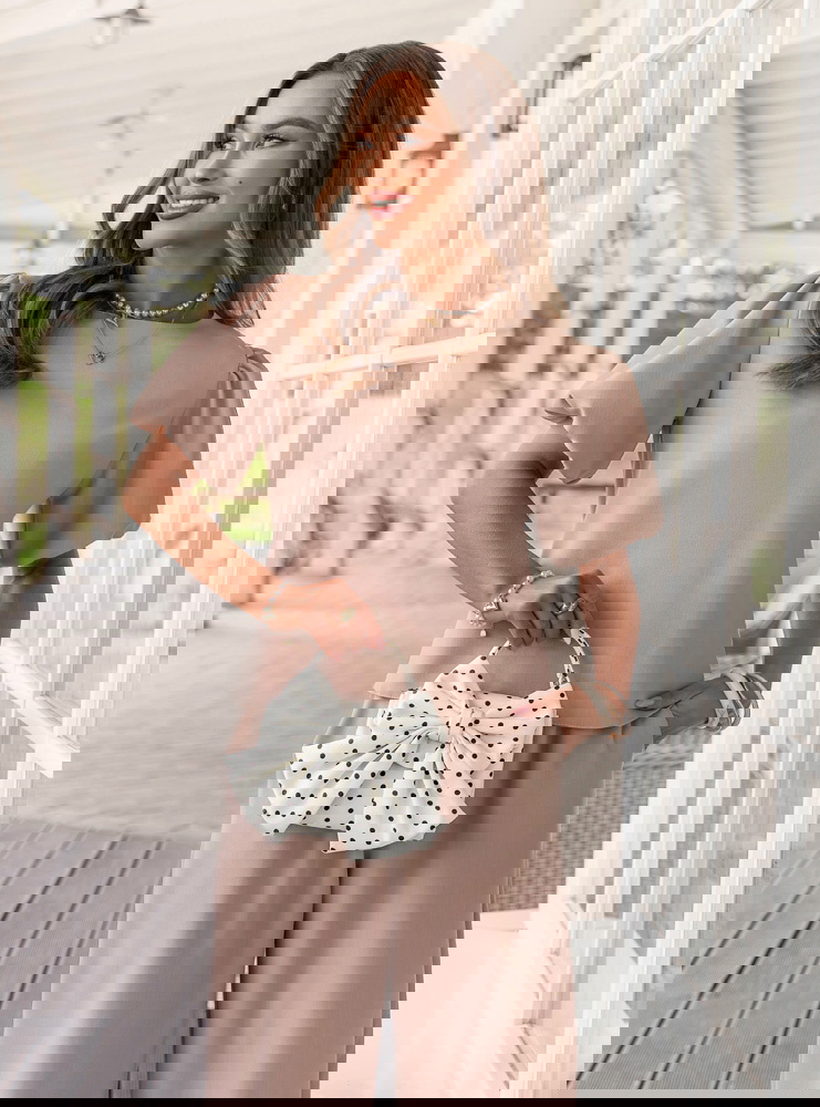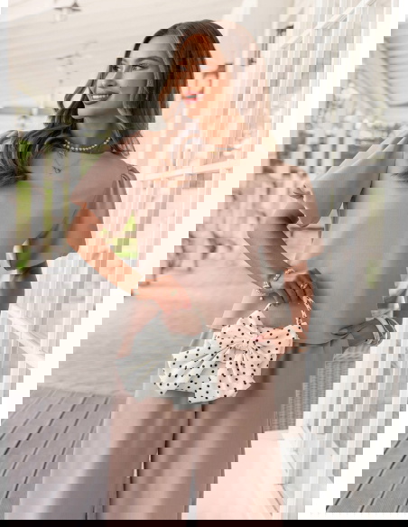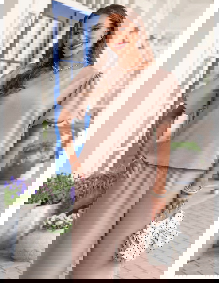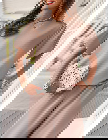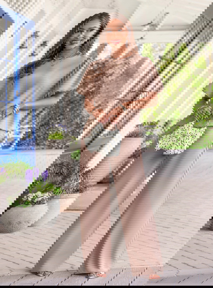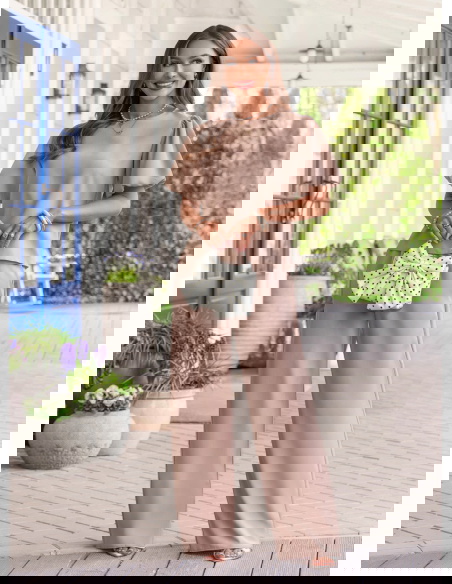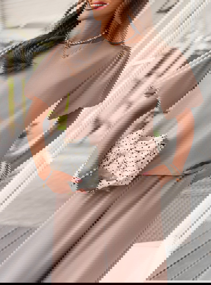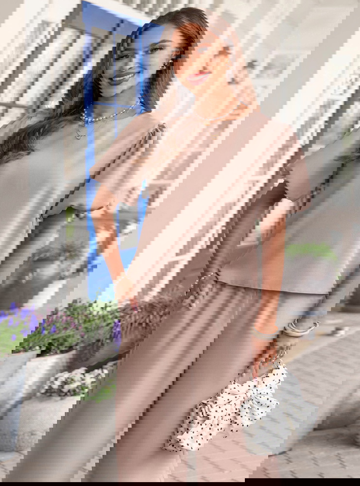 Bufiaste rękawy i kolor mocha mousse sprawiają, że ten komplet wygląda elegancko, ale nadal bardzo lekko i kobieco.