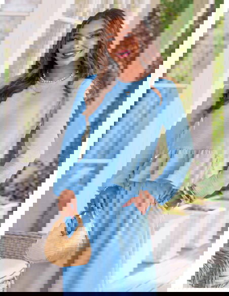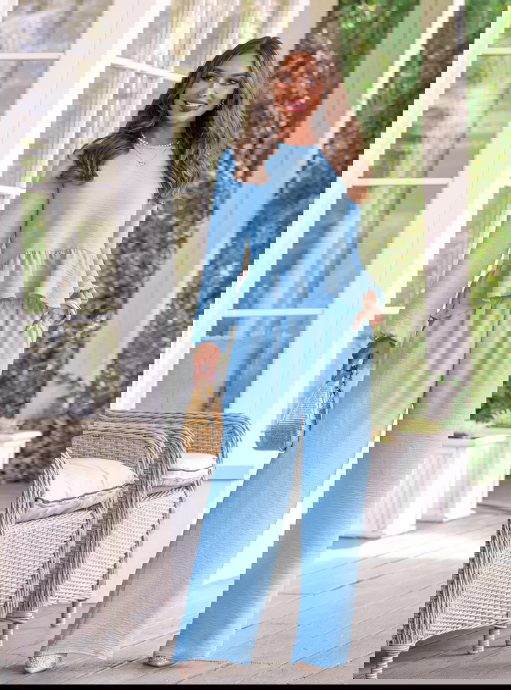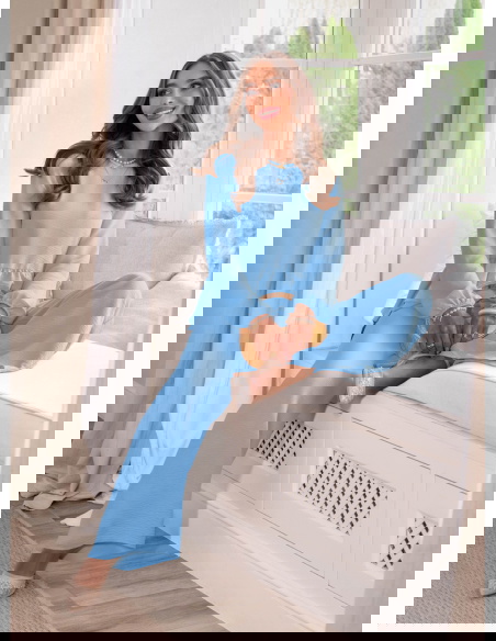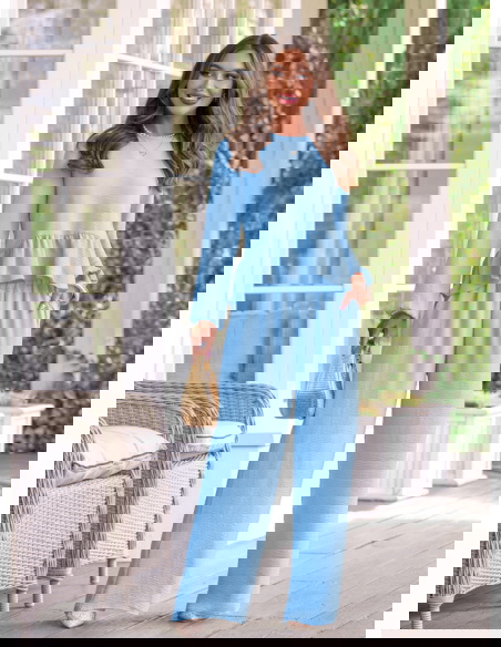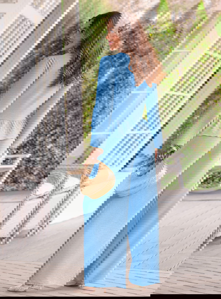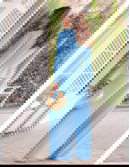 Błękitny komplet bluzka z falbanką i szerokie spodnie Frenchesca to lekka i świeża propozycja, która od razu robi efekt całej stylizacji. Bluzka z falbanką delikatnie układa się w okolicy talii, dzięki czemu sylwetka wygląda miękko i kobieco. Dłuższy rękaw dodaje subtelności i sprawia, że komplet ma bardziej dopracowany charakter. Szerokie spodnie pięknie opadają i poruszają się przy każdym kroku, dając poczucie swobody. Elastyczna talia zwiększa komfort i ułatwia dopasowanie. Błękitny kolor wprowadza świeżość i sprawia, że całość wygląda lekko i bardzo wiosennie. Ten model idealnie wpisuje się w klimat kolekcji Bonjour Paris, gdzie liczy się prostota i efekt bez wysiłku.