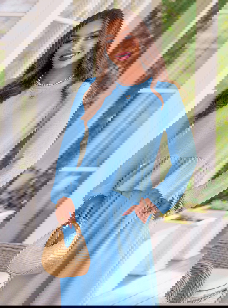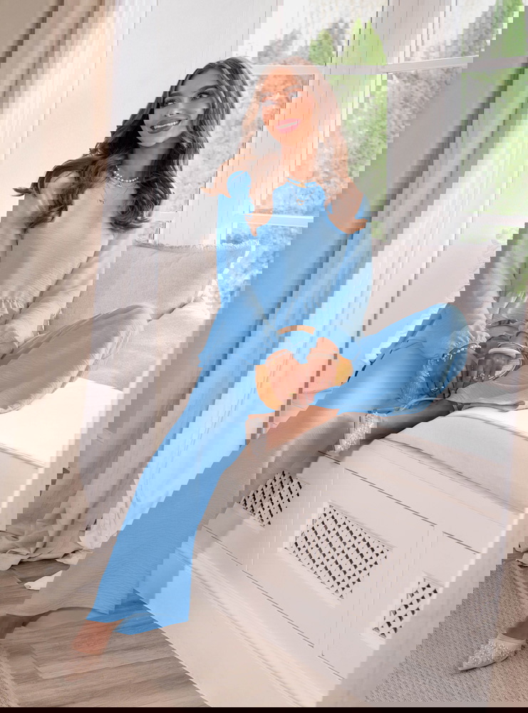 Błękit i falbanka tworzą zestaw, który wygląda świeżo, lekko i bardzo kobieco.
