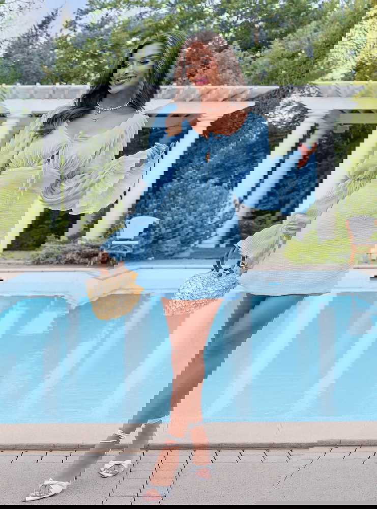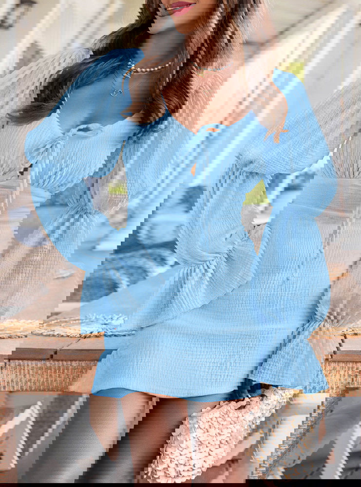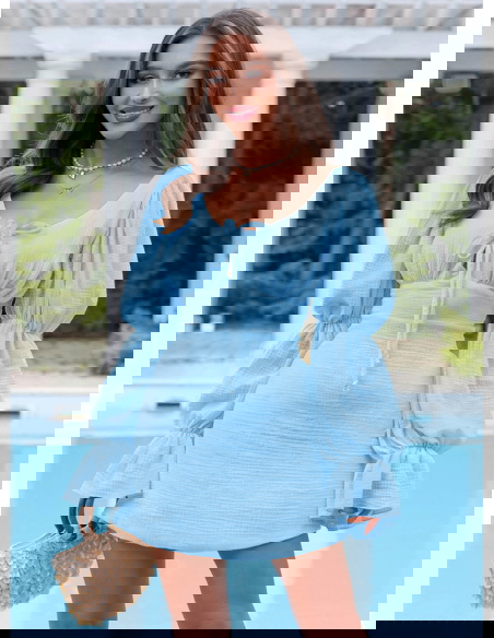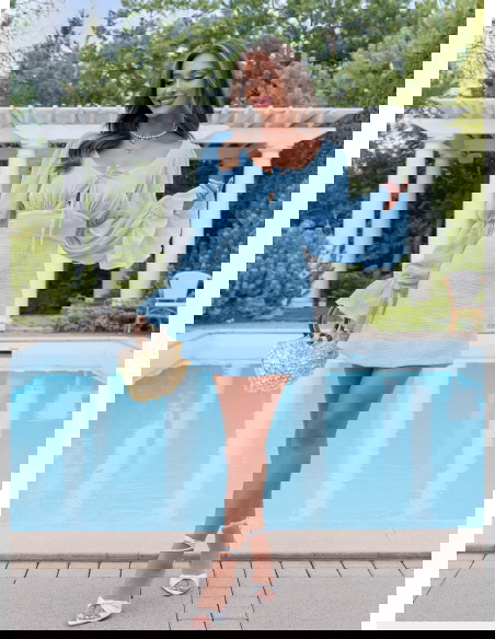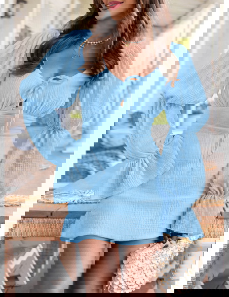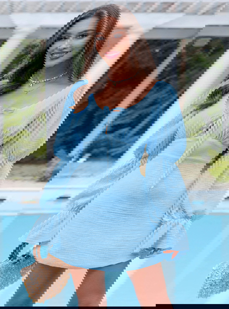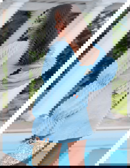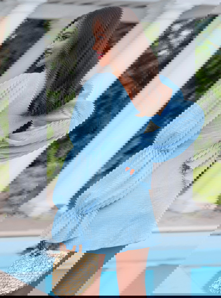 Błękitna muślinowa sukienka z wiązaniem na dekolcie Leondrea to model, który od razu przyciąga spojrzenia swoim lekkim, świeżym wyglądem. Uszyta z miękkiego muślinu, dobrze układa się na sylwetce i zapewnia komfort noszenia przez cały dzień. Dekolt z wiązaniem subtelnie podkreśla górę i pozwala dopasować jego ułożenie do siebie. Wcięcie w talii pięknie modeluje figurę i nadaje całości proporcji. Bufiaste rękawy dodają objętości i sprawiają, że sukienka wygląda bardziej wyrazisto. Z tyłu znajduje się zamek, dzięki któremu łatwo ją założyć i dopasować. To fason, który sprawdzi się jako sukienka na imprezę, randkę albo letnie wyjście. Jeśli lubisz rzeczy, które robią efekt bez przesady, ten model zdecydowanie spełnia to zadanie.