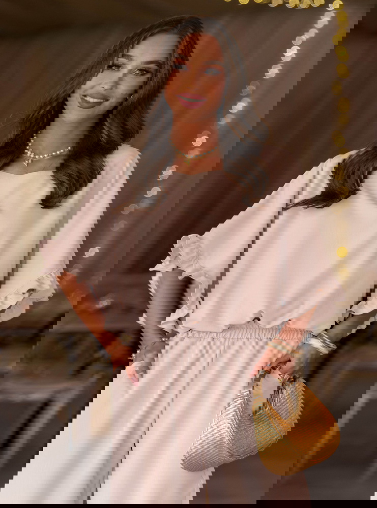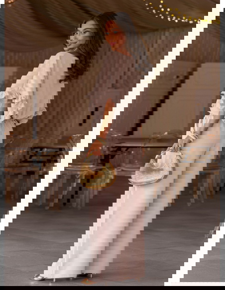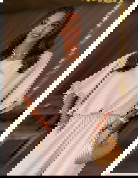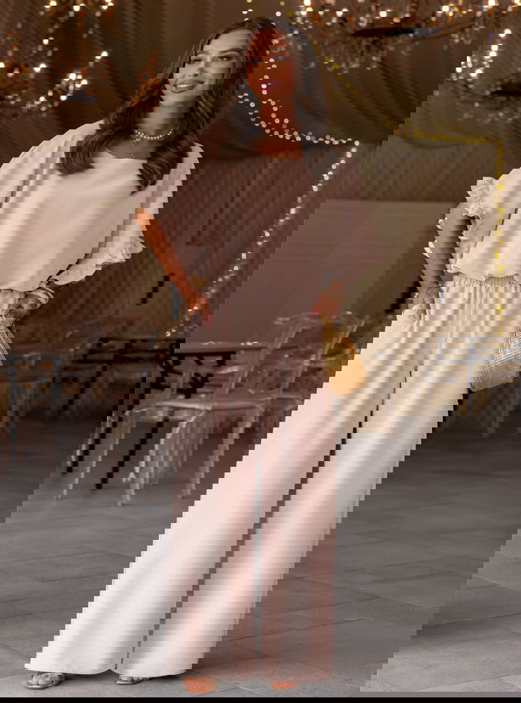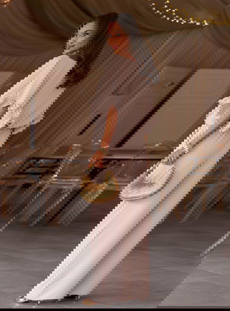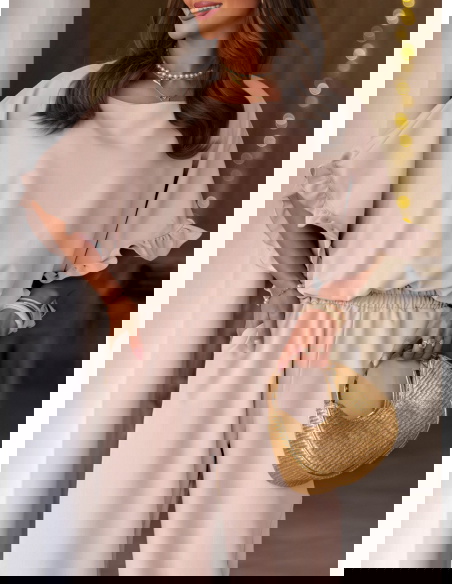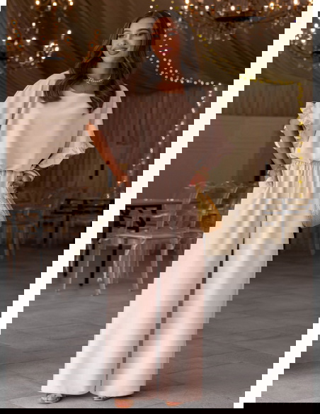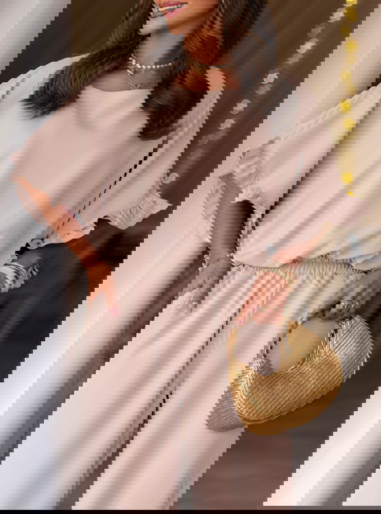 Jasnobeżowy komplet bluzka z falbankami i spodnie Prisilla to gotowy look, który łączy wygodę z eleganckim efektem. Luźniejsza bluzka z falbankami przy rękawach dodaje lekkości i subtelnego charakteru całej stylizacji. Gładki materiał ładnie układa się na sylwetce i daje przyjemne uczucie komfortu przez cały dzień. Spodnie z szeroką nogawką optycznie wydłużają nogi i sprawiają, że całość wygląda bardzo proporcjonalnie. Elastyczna talia dobrze dopasowuje się do figury i podkreśla jej kształt. To komplet, który sprawdzi się jako stylizacja na przyjęcie, spotkanie albo wyjście, kiedy chcesz wyglądać elegancko bez wysiłku. Możesz nosić go razem lub rozdzielić i tworzyć różne zestawy. Jasnobeżowy kolor dodaje świeżości i łatwo dopasować do niego dodatki.