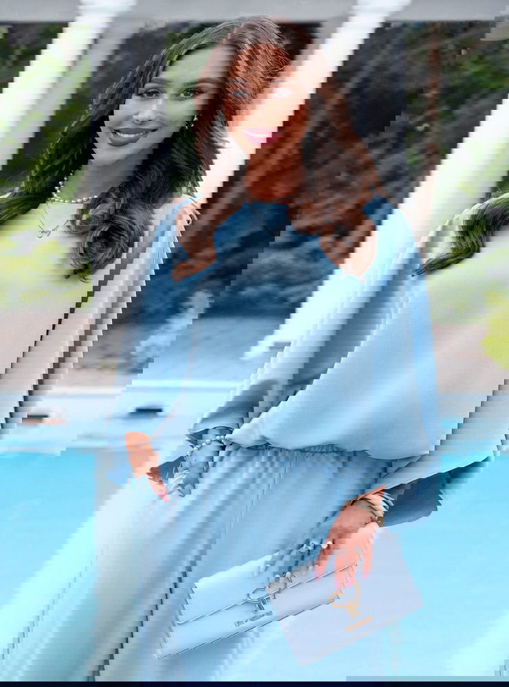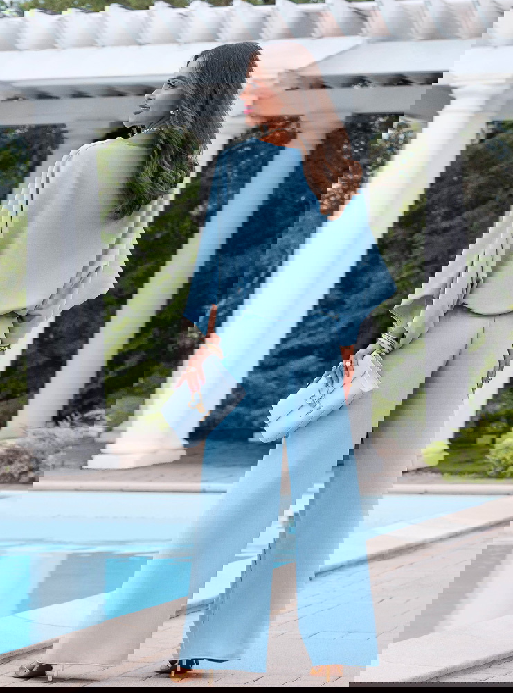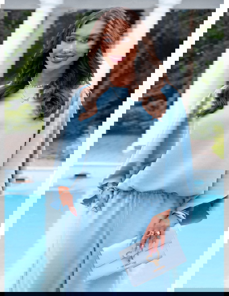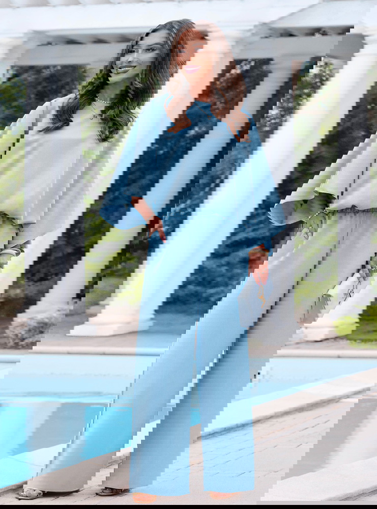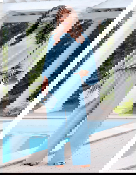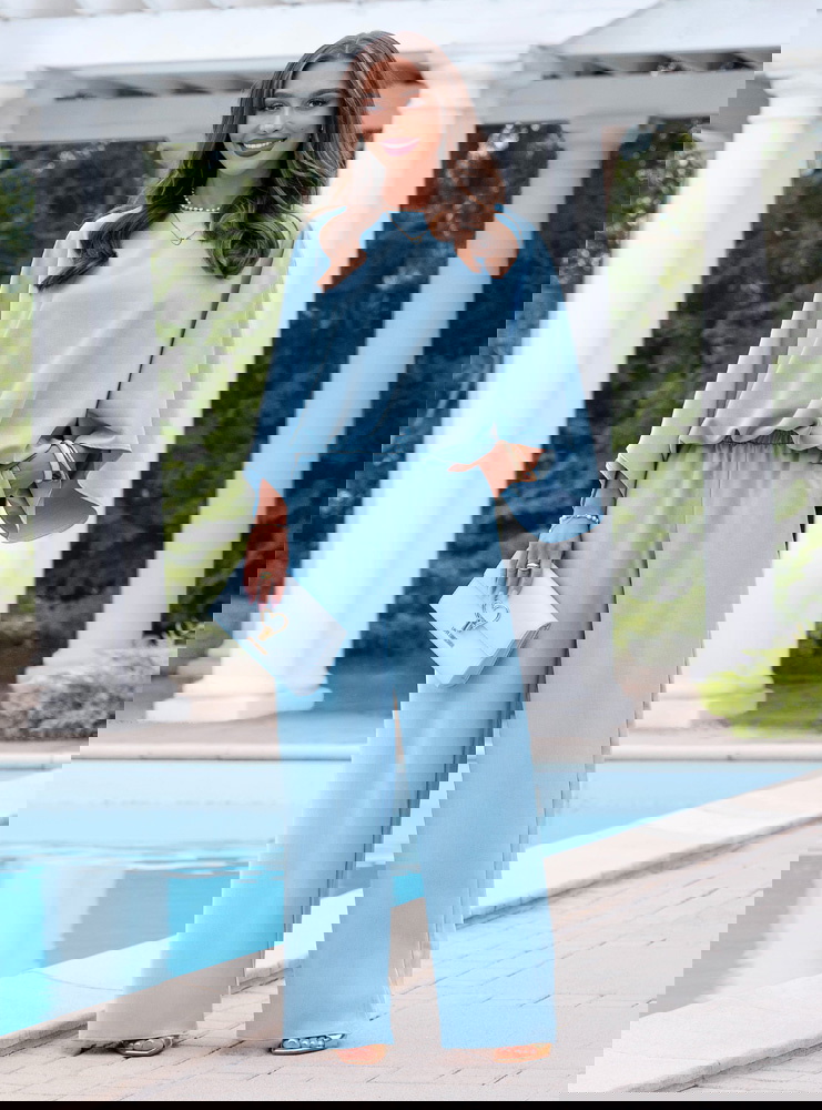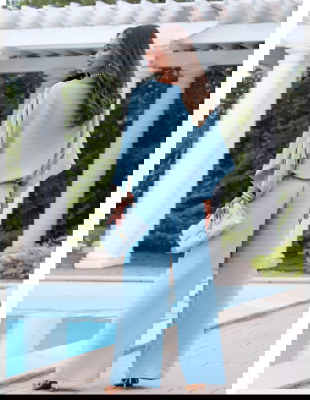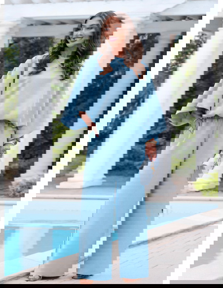 Błękitny komplet bluzka oversize i spodnie Kyrralynn to lekka, świeża propozycja, która od razu przyciąga uwagę kolorem i swobodnym krojem. Bluzka o oversize’owym fasonie miękko układa się na sylwetce i daje luźny, ale dopracowany efekt. Szerokie rękawy dodają charakteru i sprawiają, że całość wygląda bardziej nowocześnie. Spodnie z szeroką nogawką wydłużają sylwetkę i dobrze pracują w ruchu. Elastyczna talia zapewnia wygodę i dopasowanie bez ucisku. Materiał jest lekki i przyjemny, dzięki czemu komplet świetnie sprawdza się w cieplejsze dni. Błękitny kolor dodaje świeżości i idealnie wpisuje się w jasne, kobiece stylizacje. To model, który sprawdzi się zarówno na co dzień, jak i na wyjścia.