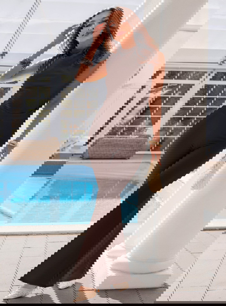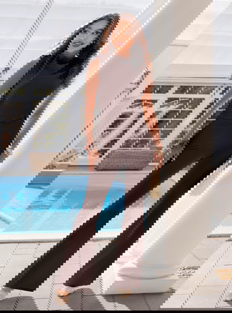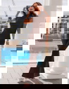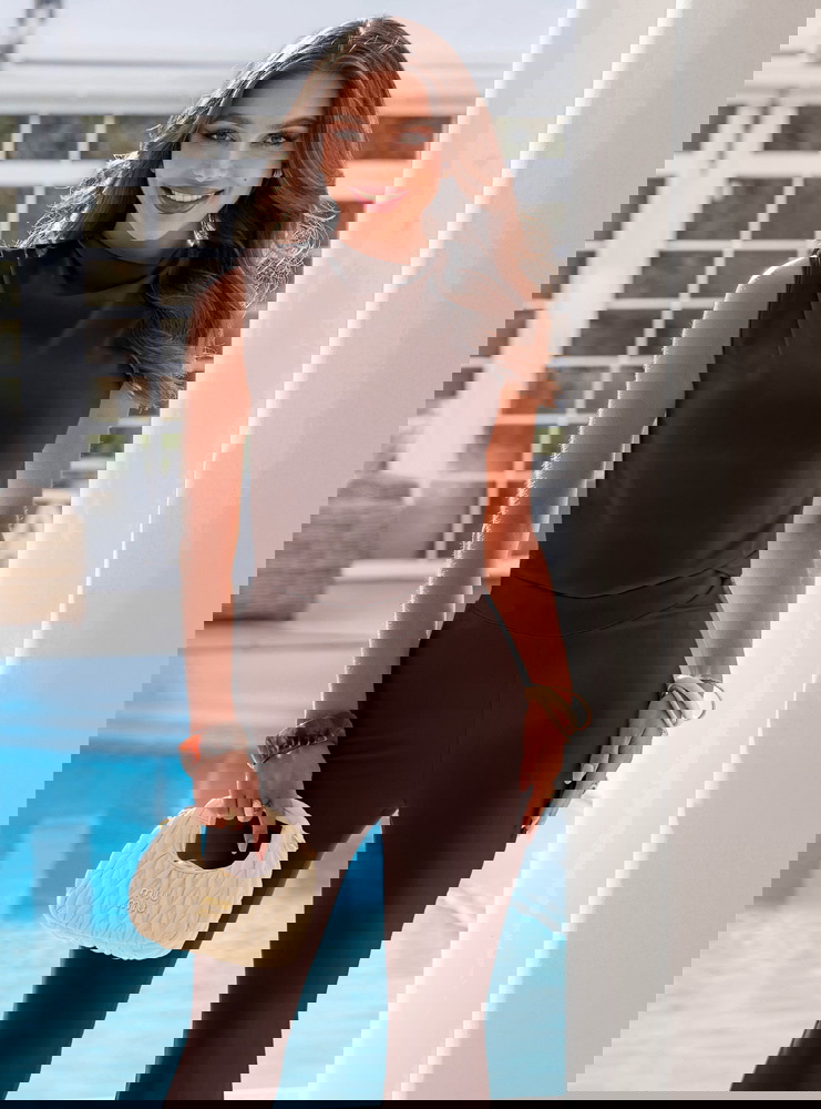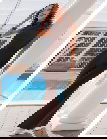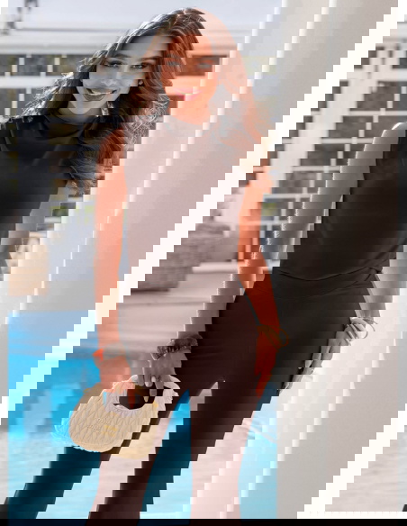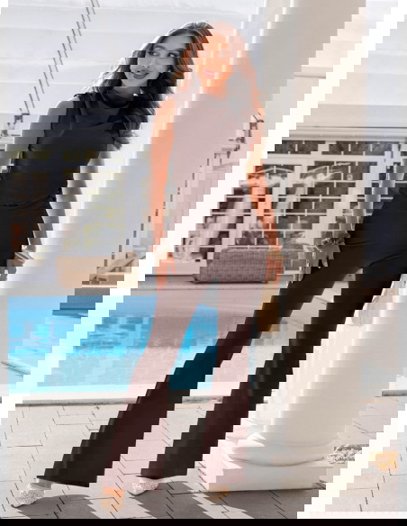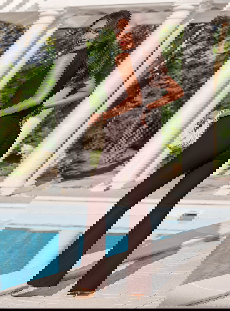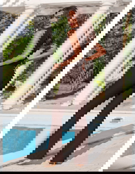 Czekoladowy komplet bluzka i spodnie typu dzwony Kristenaa to model, który od razu podkreśla sylwetkę i nadaje jej wyrazisty charakter. Dopasowana bluzka bez rękawów z delikatnie zabudowanym dekoltem wygląda elegancko i nowocześnie, a przy tym dobrze układa się na ciele. Spodnie typu dzwony optycznie wydłużają nogi i budują proporcje, które przyciągają uwagę. Marszczenie z tyłu podkreśla kształty i dodaje całości bardziej kobiecego wykończenia. Materiał jest elastyczny i przyjemny w noszeniu, dzięki czemu komplet dopasowuje się do ruchu. Talia jest wyraźnie zaznaczona, co dodatkowo modeluje figurę. Czekoladowy kolor wygląda głęboko i elegancko, świetnie wpisując się w bardziej dopracowane stylizacje. To zestaw, który robi efekt bez większego wysiłku.