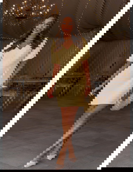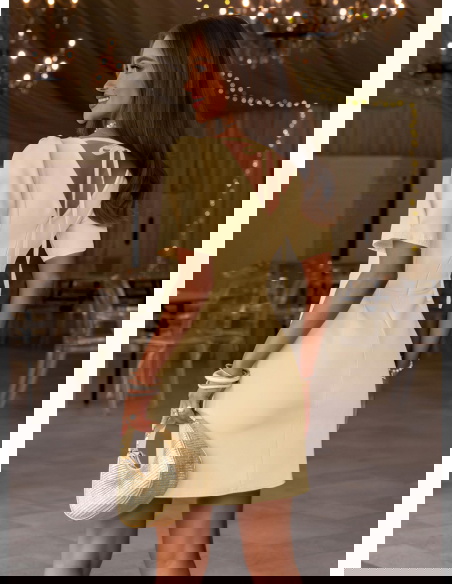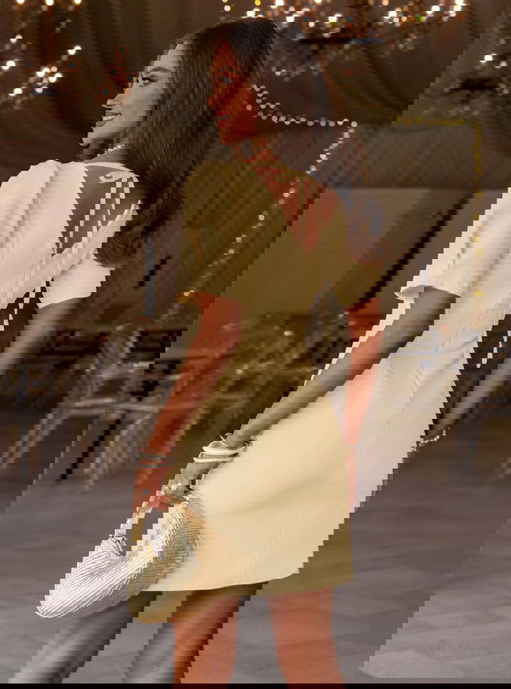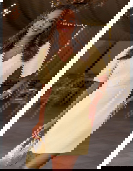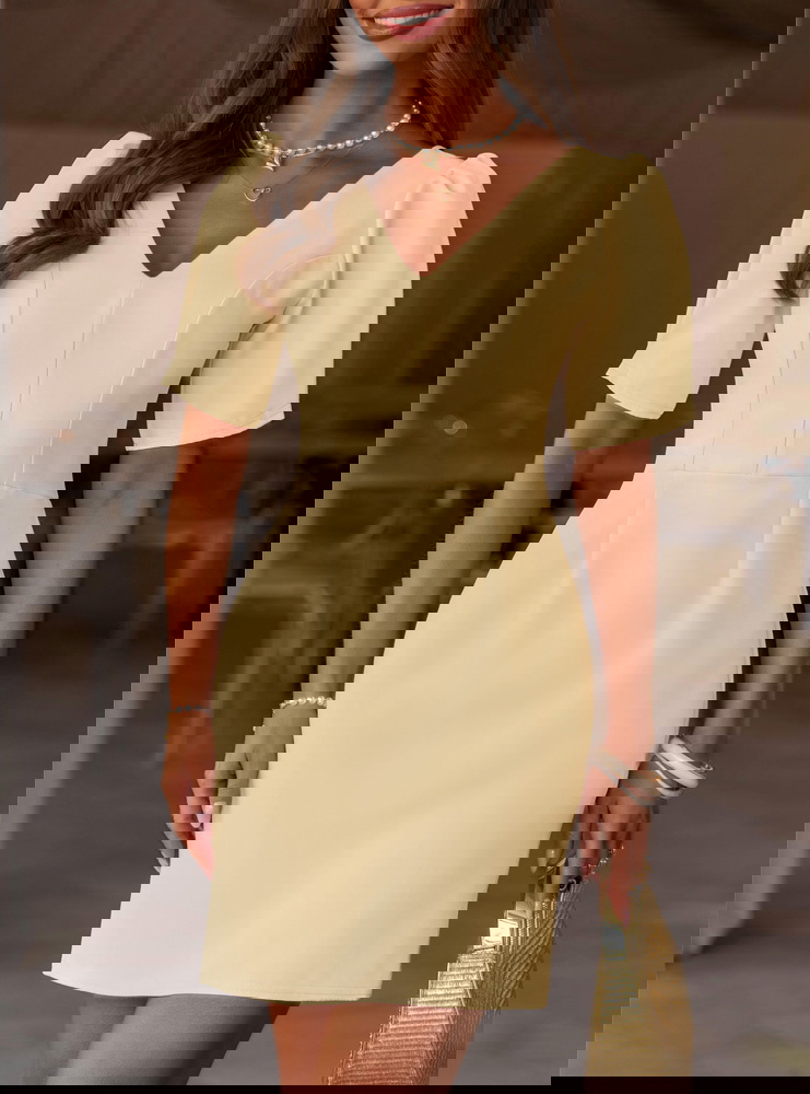Sukienka mini z dekoltem w serek Shanesee - masełkowa to kobiecy model, który łączy prostotę z subtelnym, eleganckim wykończeniem. Dopasowana góra z dekoltem w serek pięknie podkreśla linię szyi i biustu, a lekko rozkloszowany dół dodaje lekkości całej sylwetce. Krótki rękaw delikatnie osłania ramiona i sprawia, że sukienka wygląda bardzo proporcjonalnie. Z tyłu znajduje się zamek, który ułatwia zakładanie i zapewnia dobre dopasowanie. Wiązanie na plecach przyciąga uwagę i dodaje całości dziewczęcego uroku. Masełkowy kolor wygląda świeżo i lekko, idealnie wpisując się w wiosenno-letni klimat. To model, który świetnie sprawdzi się w wielu codziennych i bardziej wyjątkowych sytuacjach.
