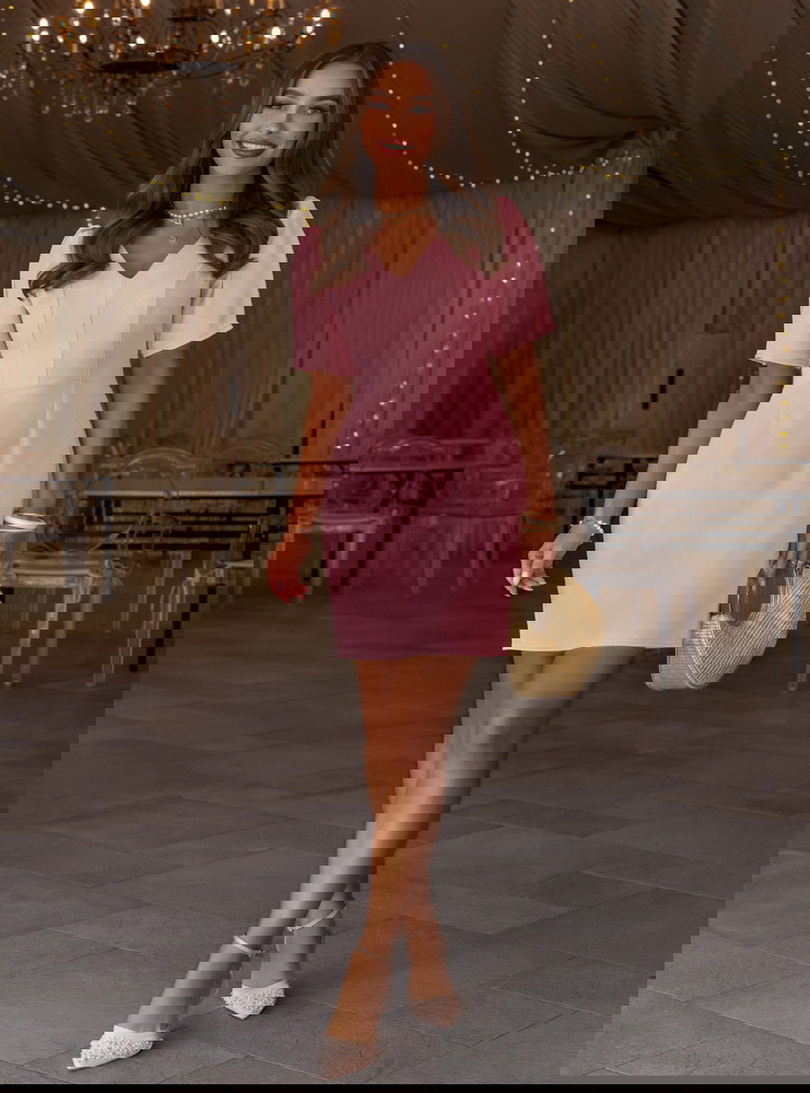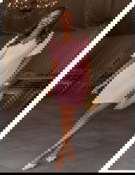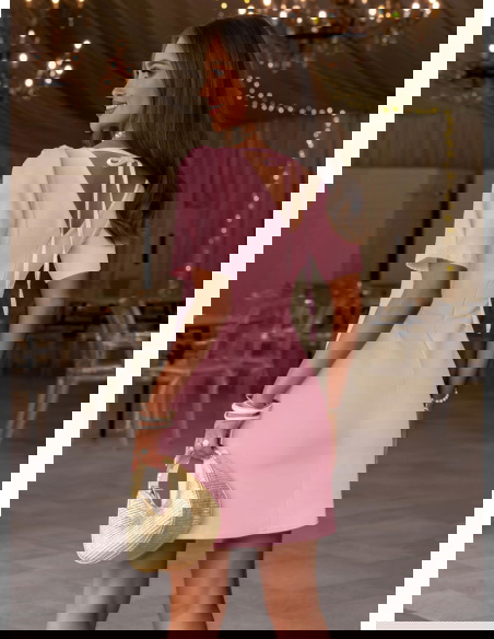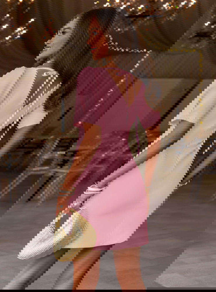 Pudrowa sukienka mini z dekoltem w serek Shanesee to delikatna i bardzo kobieca propozycja, która świetnie podkreśla sylwetkę i dodaje lekkości całej stylizacji. Dopasowana góra z dekoltem w serek eksponuje linię szyi i biustu, a subtelne przeszycia modelują talię. Krótki rękaw nadaje całości proporcji i sprawia, że sukienka wygląda elegancko, ale wciąż świeżo. Z tyłu znajduje się zamek, który ułatwia zakładanie i zapewnia dobre dopasowanie. Wiązanie na plecach przyciąga uwagę i dodaje uroku, tworząc efektowny tył. Pudrowy kolor wygląda lekko i romantycznie, idealnie wpisując się w kobiece stylizacje. To model, który sprawdzi się zarówno na co dzień, jak i na wyjątkowe okazje.