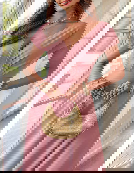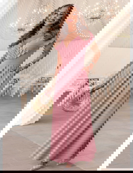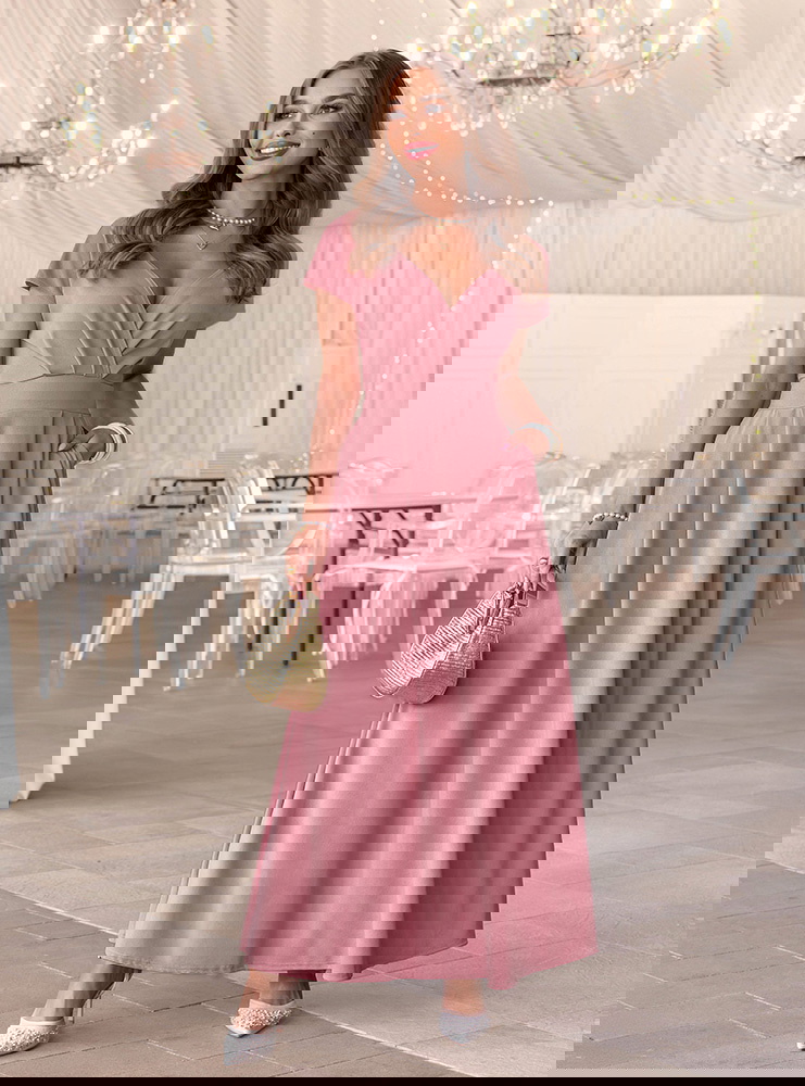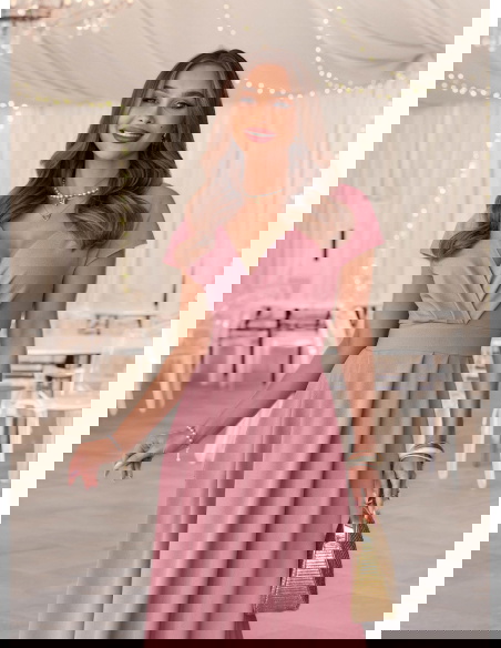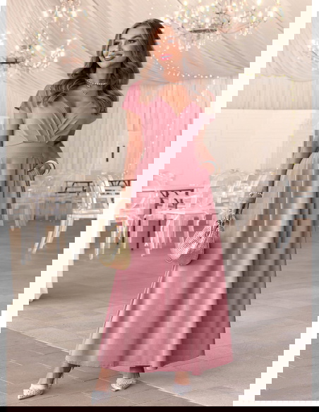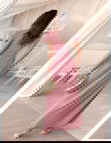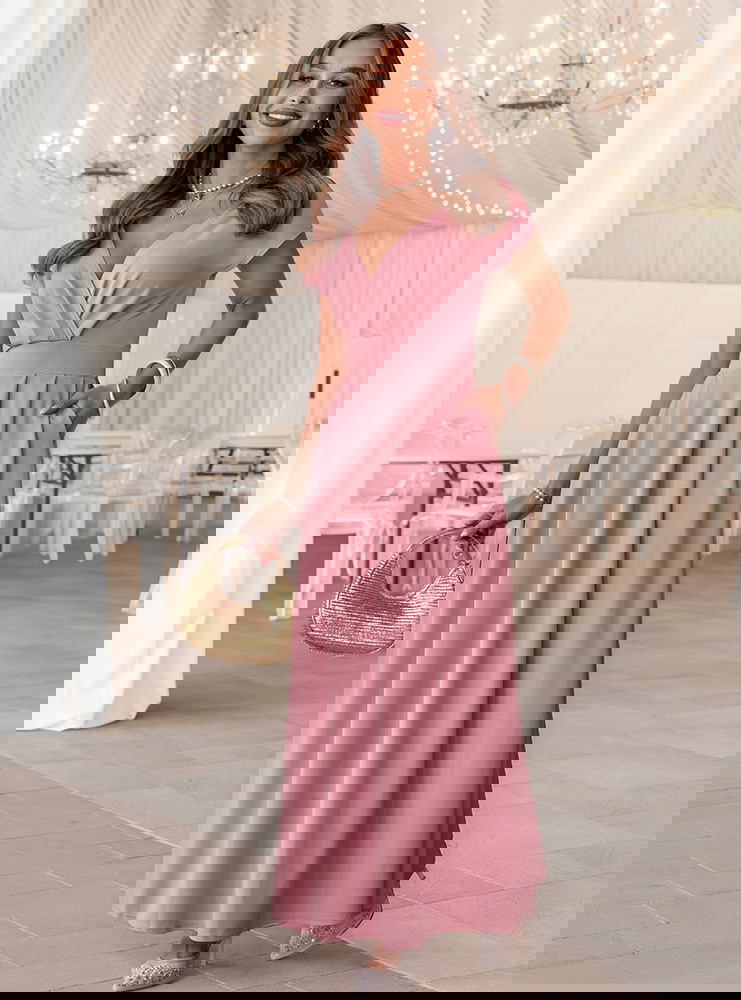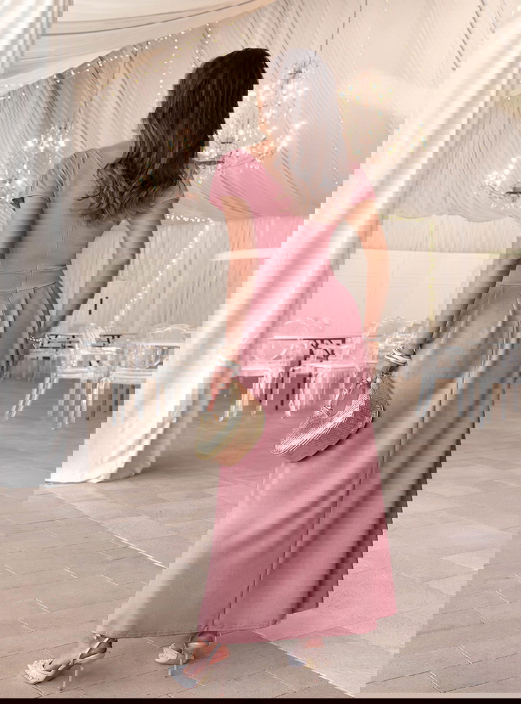 Sukienka maxi z przekładanym dekoltem Santena - brudny róż to subtelna i bardzo kobieca propozycja, która przyciąga uwagę swoim delikatnym kolorem. Przekładany dekolt pięknie eksponuje górę sylwetki i dodaje lekkości całej formie. Dopasowana talia podkreśla proporcje, a rozkloszowany dół miękko układa się w ruchu. Model posiada kieszenie, które zwiększają komfort noszenia, a zamek z tyłu ułatwia zakładanie i dopasowanie. Krótki rękaw sprawia, że sukienka wygląda lekko i elegancko jednocześnie. Brudny róż to odcień, który pasuje do wielu okazji i świetnie komponuje się z jasnymi dodatkami. To model, który sprawdzi się jako sukienka na wesele, komunię lub inne wyjątkowe wydarzenie.