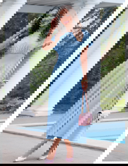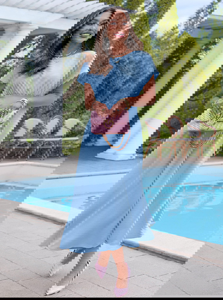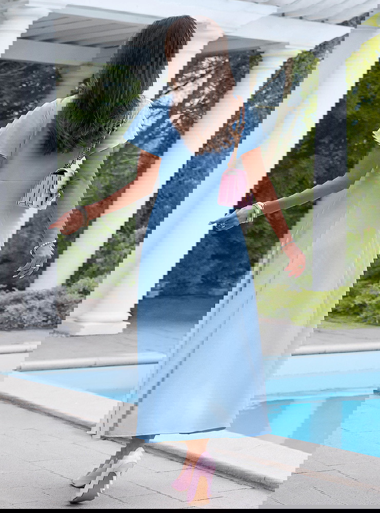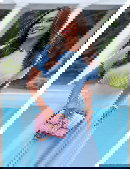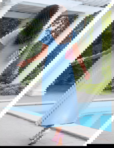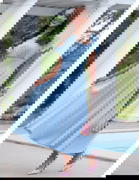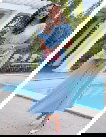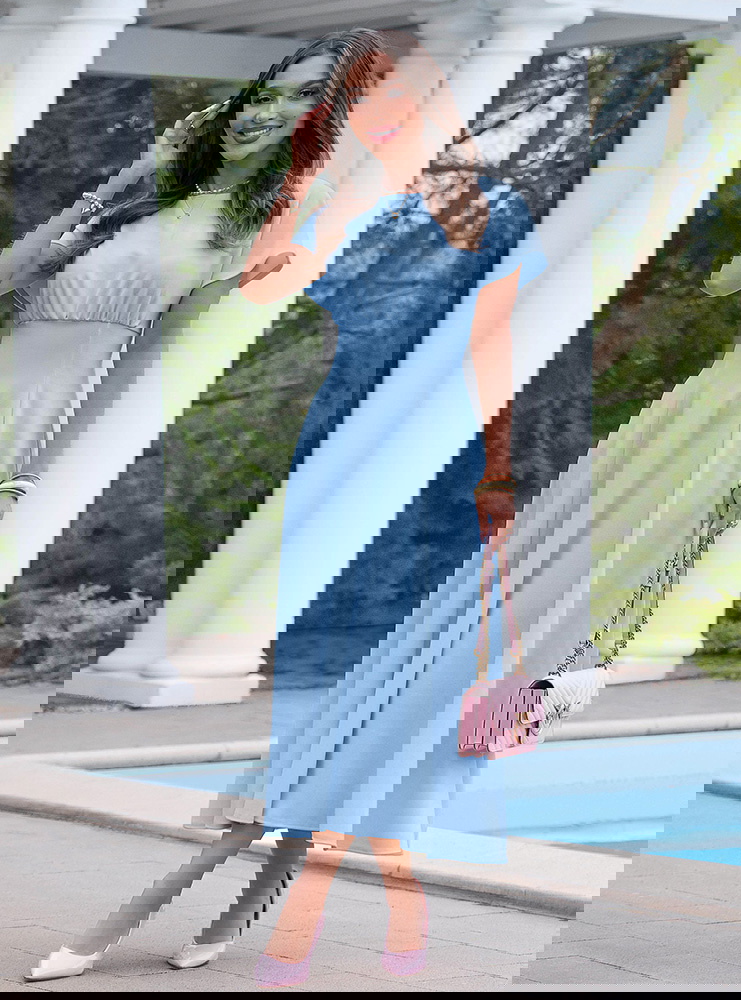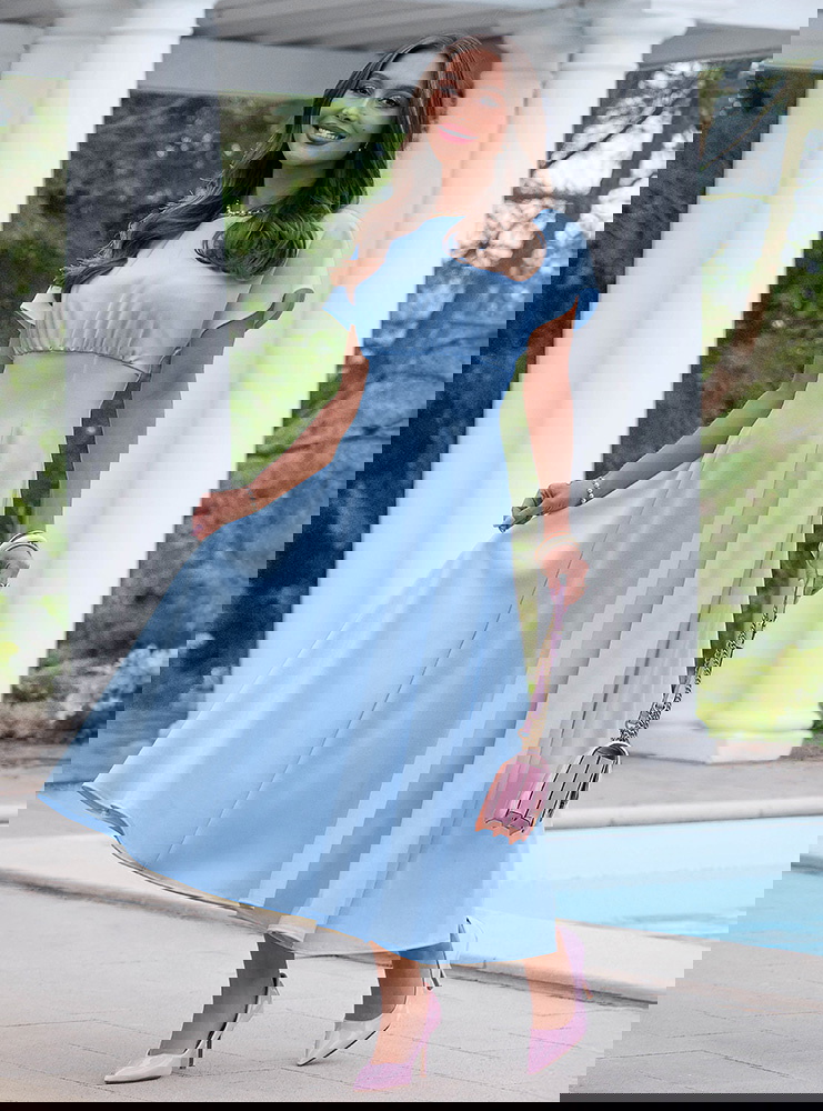 Błękitna sukienka z krótkim rękawem Printha to lekka i świeża propozycja, która od razu kojarzy się z elegancką prostotą. Dopasowana góra z delikatnym marszczeniem podkreśla talię i nadaje sylwetce harmonijnych proporcji. Krótki rękaw subtelnie opada na ramiona, dodając całości zwiewności. Rozkloszowany dół pięknie pracuje w ruchu i nadaje stylizacji lekkości. Błękitny kolor wygląda bardzo delikatnie i świetnie komponuje się z jasnymi dodatkami. Fason jest wygodny i nie krępuje ruchów, dzięki czemu sprawdzi się przez cały dzień. To model, który sprawdzi się jako sukienka na komunię, wesele lub eleganckie spotkanie.