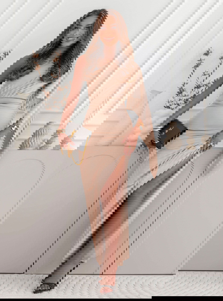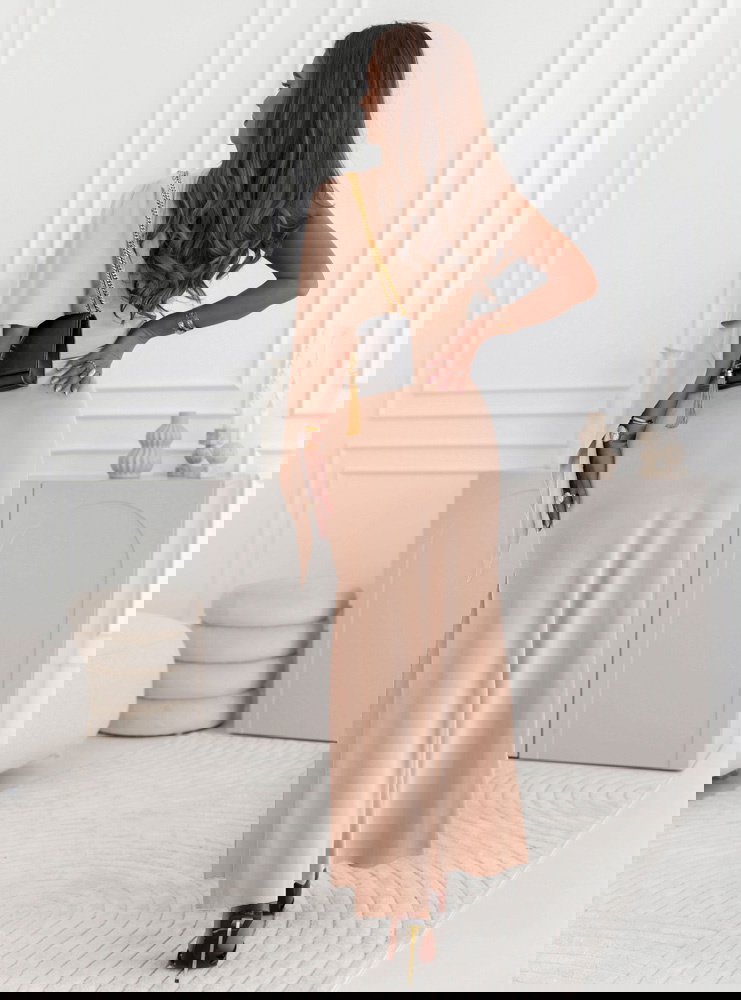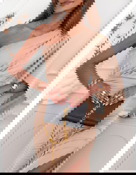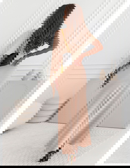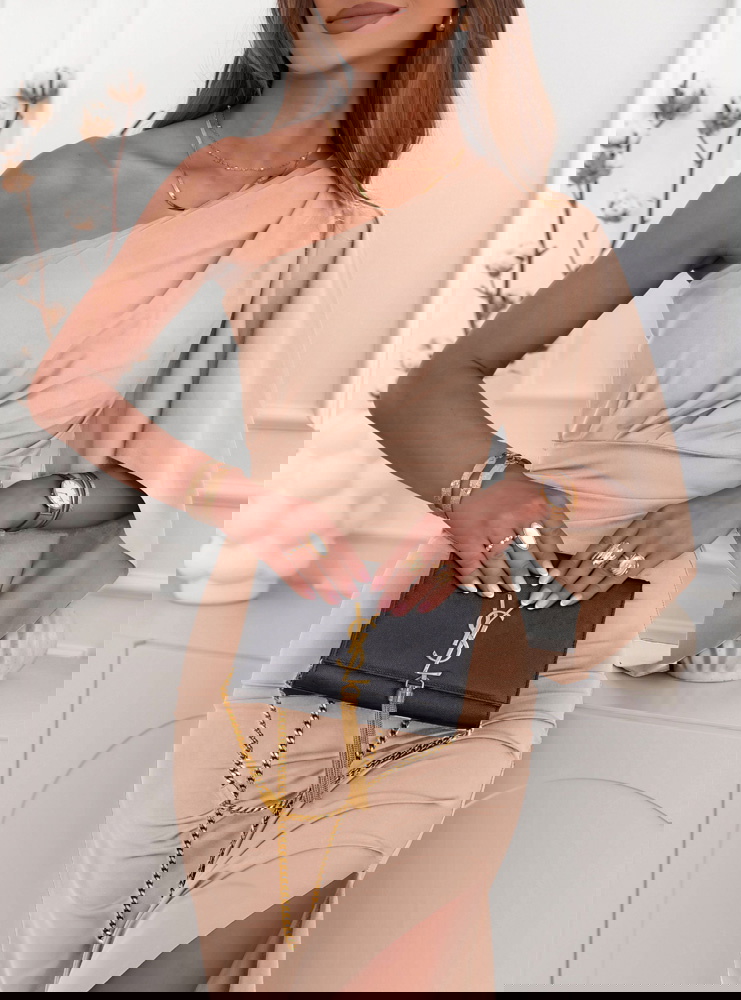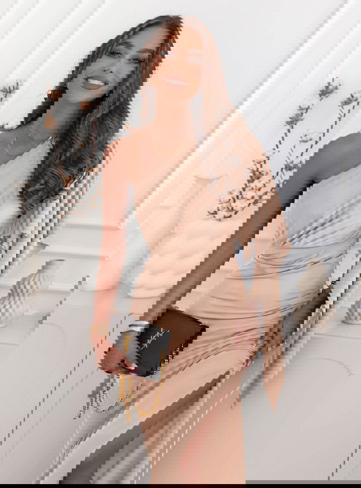 Beżowa sukienka na jedno ramię z rozcięciem Nunize
