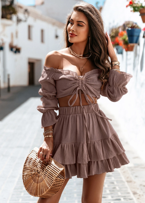 Dla miłośniczek bardziej romantycznych stylizacji doskonałym wyborem będzie komplet KRISTAINA. Składa się z topu typu hiszpanka i marszczonej spódniczki mini w kolorze mocha mousse. To świetna propozycja na letnie wieczory, randkę lub wakacyjny spacer. Fason podkreśla talię, a zwiewny muślin pięknie układa się w ruchu.